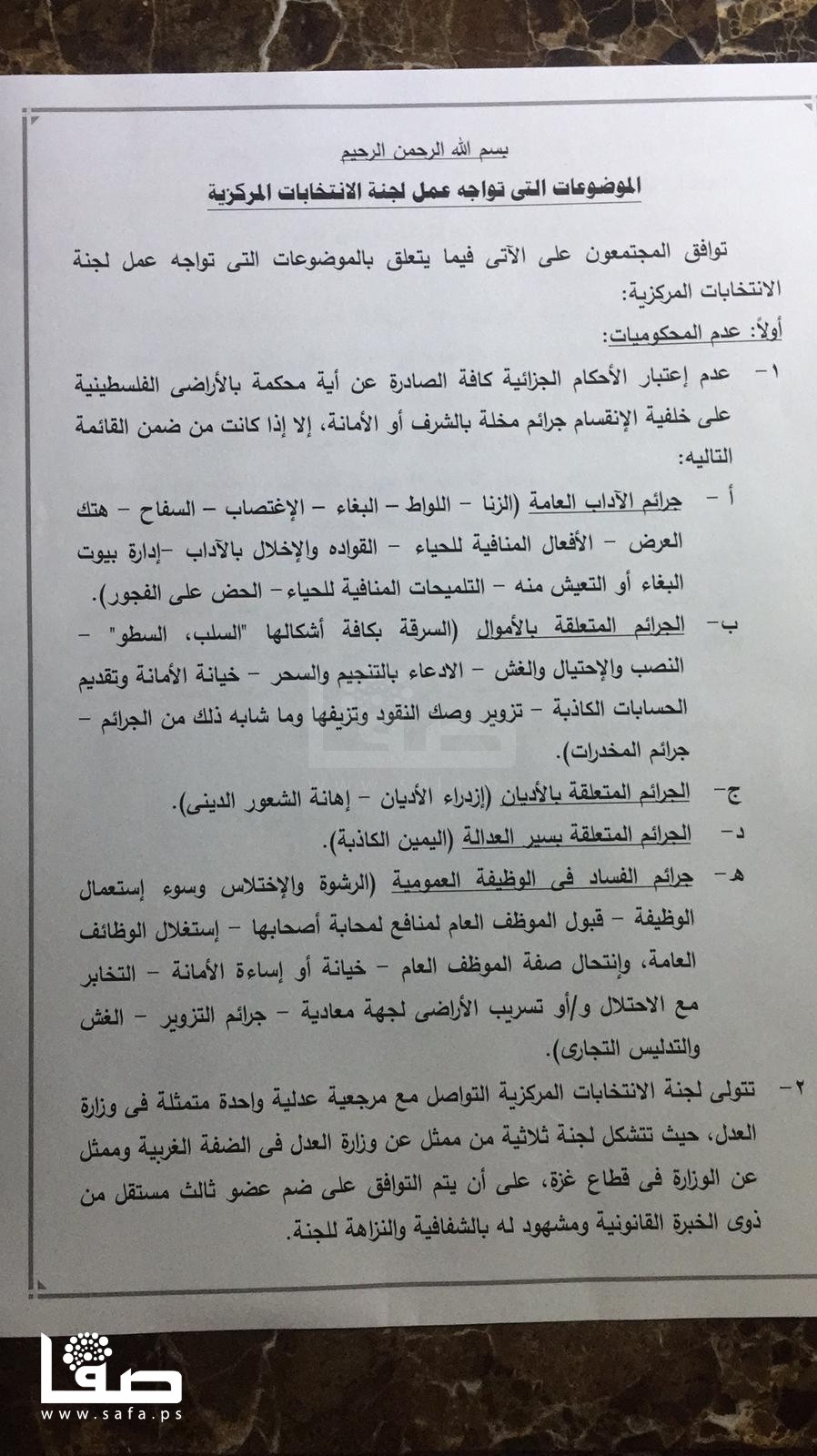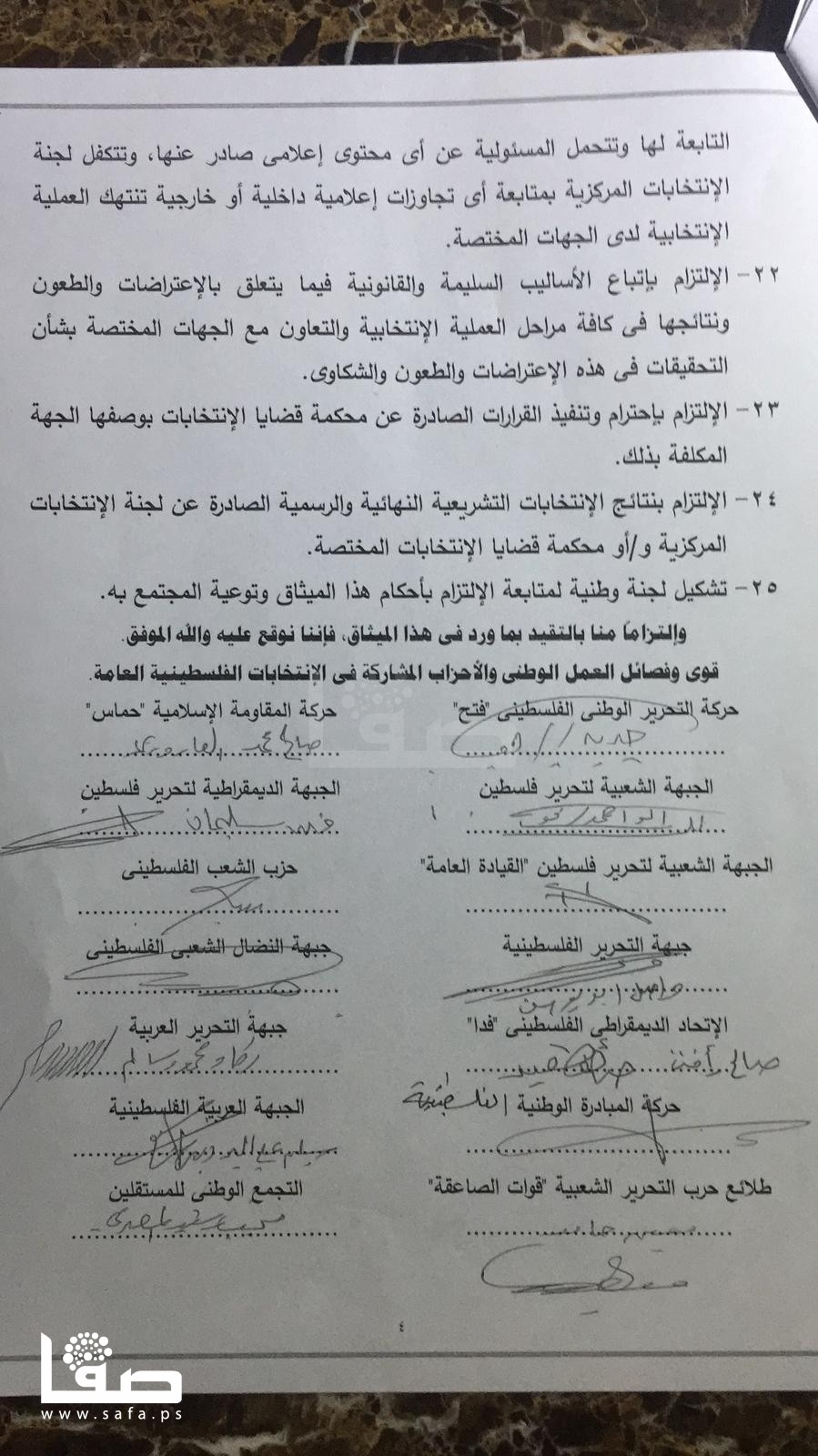 كشفت مصادر مطلعة لوكالة "صفا" عن أن الفصائل والقوى الفلسطينية وقعت على وثيقة شرف تتضمن التوافق على كافة القضايا المتعلقة بسير عملية الانتخابات.