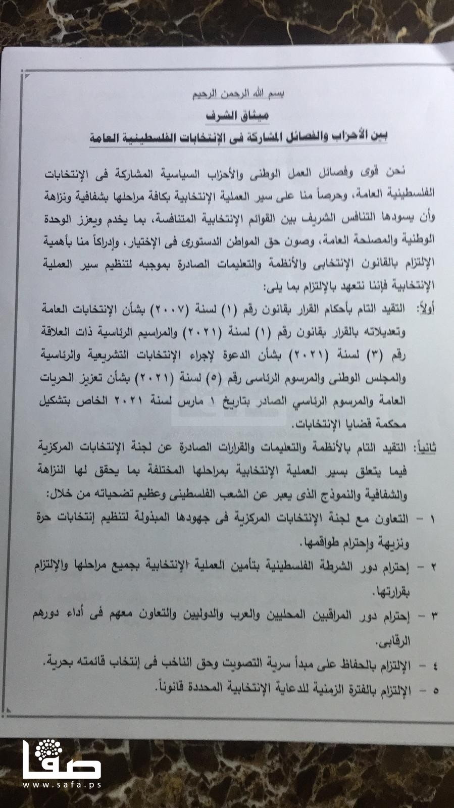 نحن قوى وفصائل العمل الوطني والأحزاب السياسية المشاركة في الانتخابات الفلسطينية العامة، وحرصا منا على سير العملية الانتخابية بكافة مراحلها بشفافية ونزاهة وأن يسودها التنافس الشريف بين القوائم الانتخابية المتنافسة، بما يخدم ويعزز الوحدة الوطنية والمصلحة العامة، وصون حق المواطن الدستوري في الاختيار، وإدراكا منا بأهمية الإلتزام بالقانون الإنتخابي والأنظمة والتعليمات الصادرة بموجبه لتنظيم سير العملية الإنتخابية فإننا نتعهد بالإلتزام بما يلي: