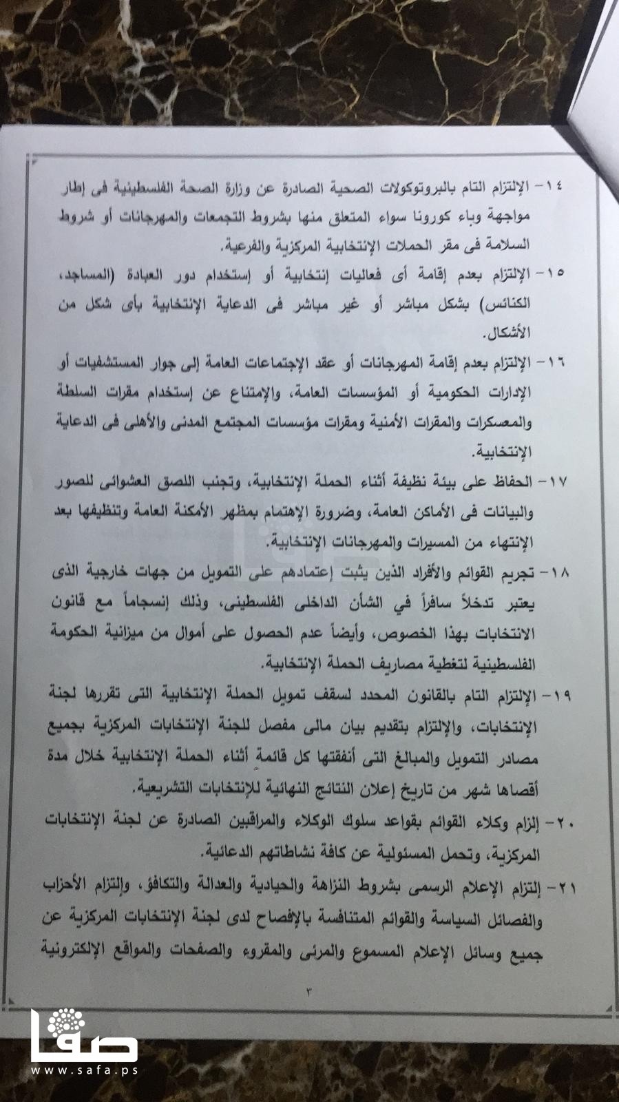 14-الالتزام التام بالبروتوكولات الصحية الصادرة عن وزارة الصحة الفلسطينية في إطار مواجهة وباء "كورونا" سواء المتعلق منها بشروط التجمعات والمهرجانات أو شروط السلامة في مقر الحملات الانتخابية المركزية والفرعية.