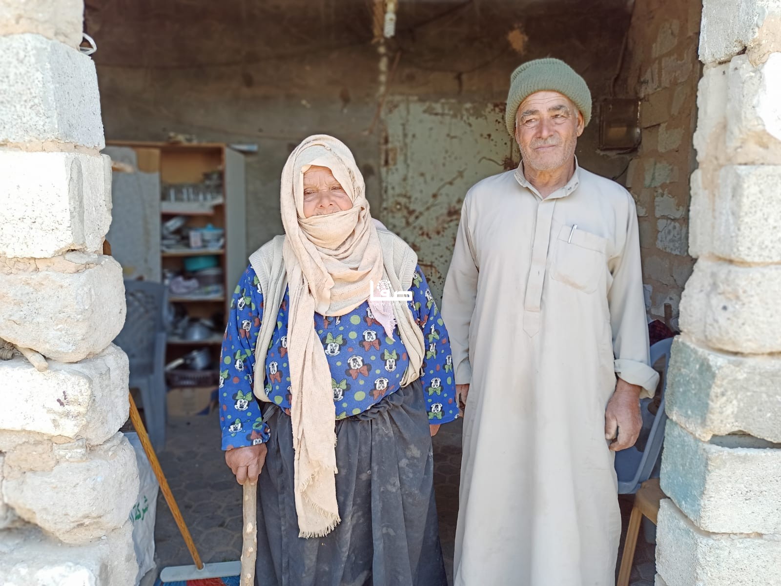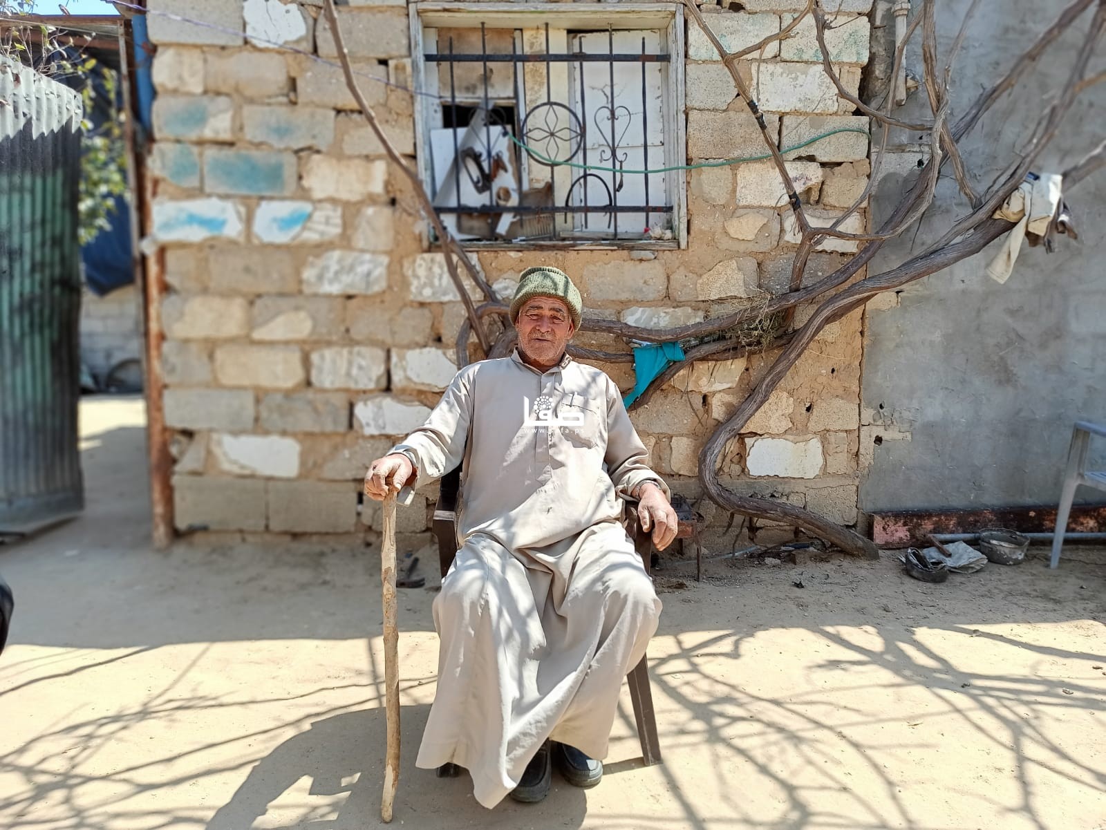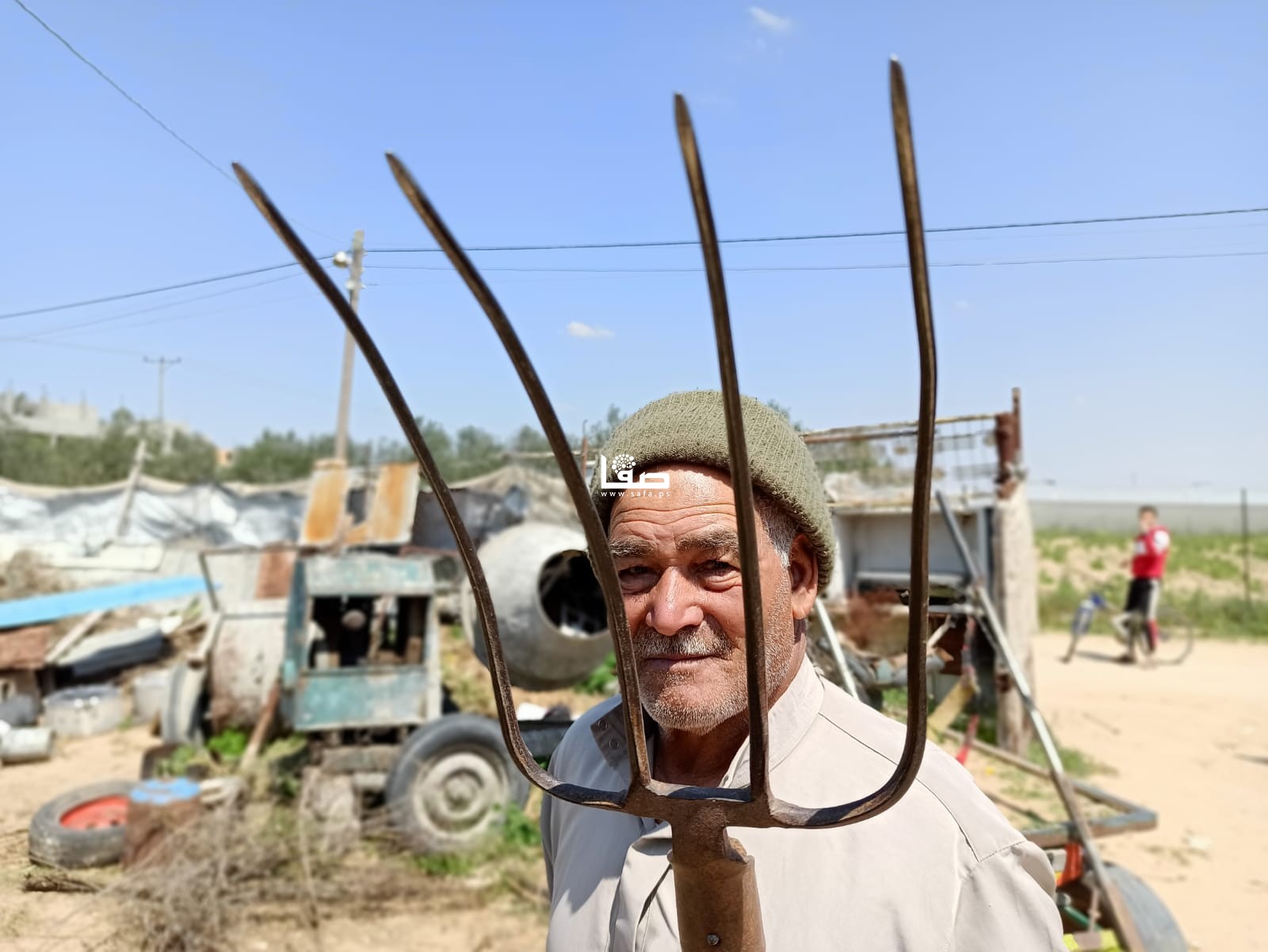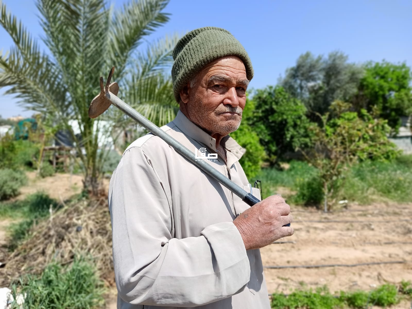 المُسن محمد أبو رجيلة (77 عامًا) رغم كبر سنه يضرب بفأسٍ حديدي قديم في تراب ما تبقى من أرضه التي تبعد قرابة 600 متر عن السياج الأمني، حيث يعتني بأشجار الزيتون التي زرعها منذ سنوات، ويزيل الحشائش الضارة منها، في عمل ترافقه فيه بشكل شبه يومي زوجته الطاعنة في السن.