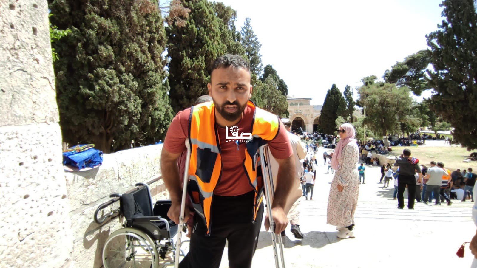 ضابط اسعاف في جمعية برج اللقلق محمد زين يعبر عن فرحته الكبيرة بالعمل وإصراره على خدمة المصلين في الأقصى، رغم الإعاقة التي تعرض لها.