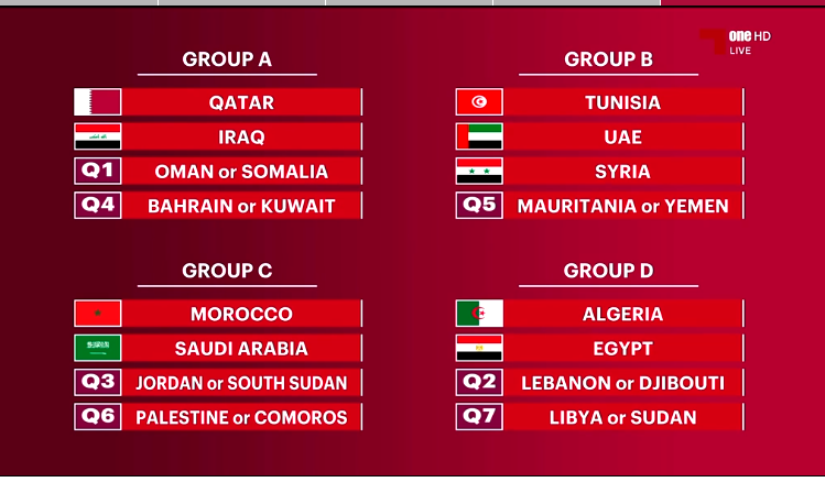 وجاءت نتيجة القرعة، نارية؛ حيث ضمت المجموعة الأولى منتخب قطر (المنظم للبطولة) مع العراق، والفائز من مواجهة عُمان والصومال، والفائز من مواجهة البحرين والكويت، فيما ضمت المجموعة الثانية منتخبات، تونس، والإمارات، وسوريا، والفائز من مواجهة موريتانيا واليمن.