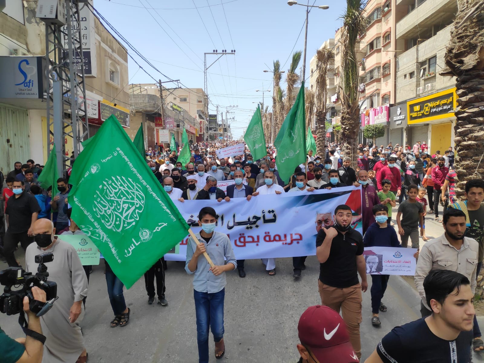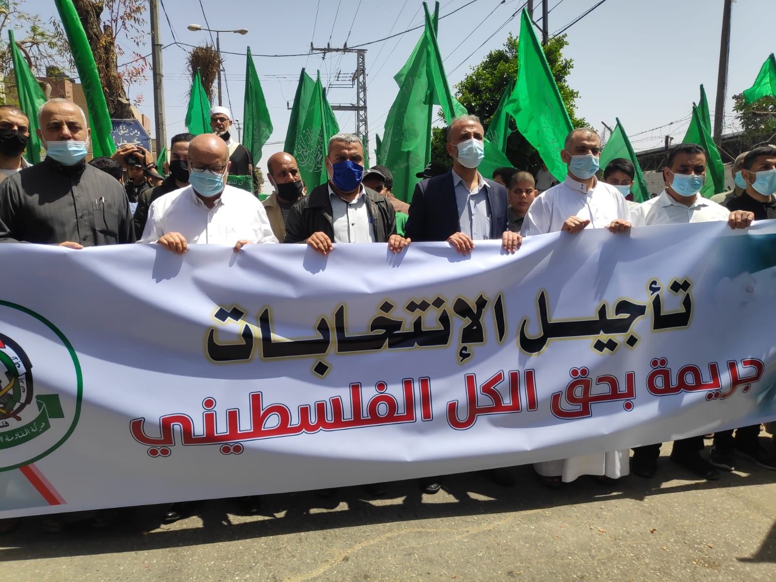 وفي مسيرة حاشدة بشمالي القطاع، استهجنت حركة حماس، ما وصفته "انقلاب" الرئيس محمود عباس على خيار الانتخابات وحرمان الشعب الفلسطيني من ممارسه حقه في تجديد مؤسساته وشرعياته.