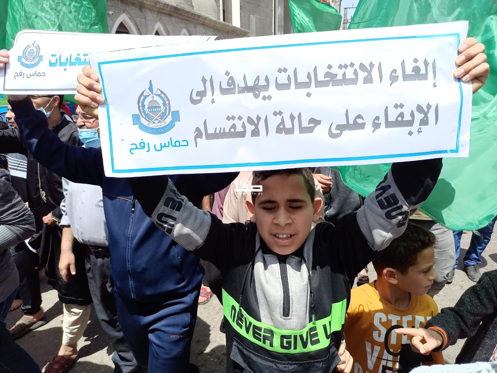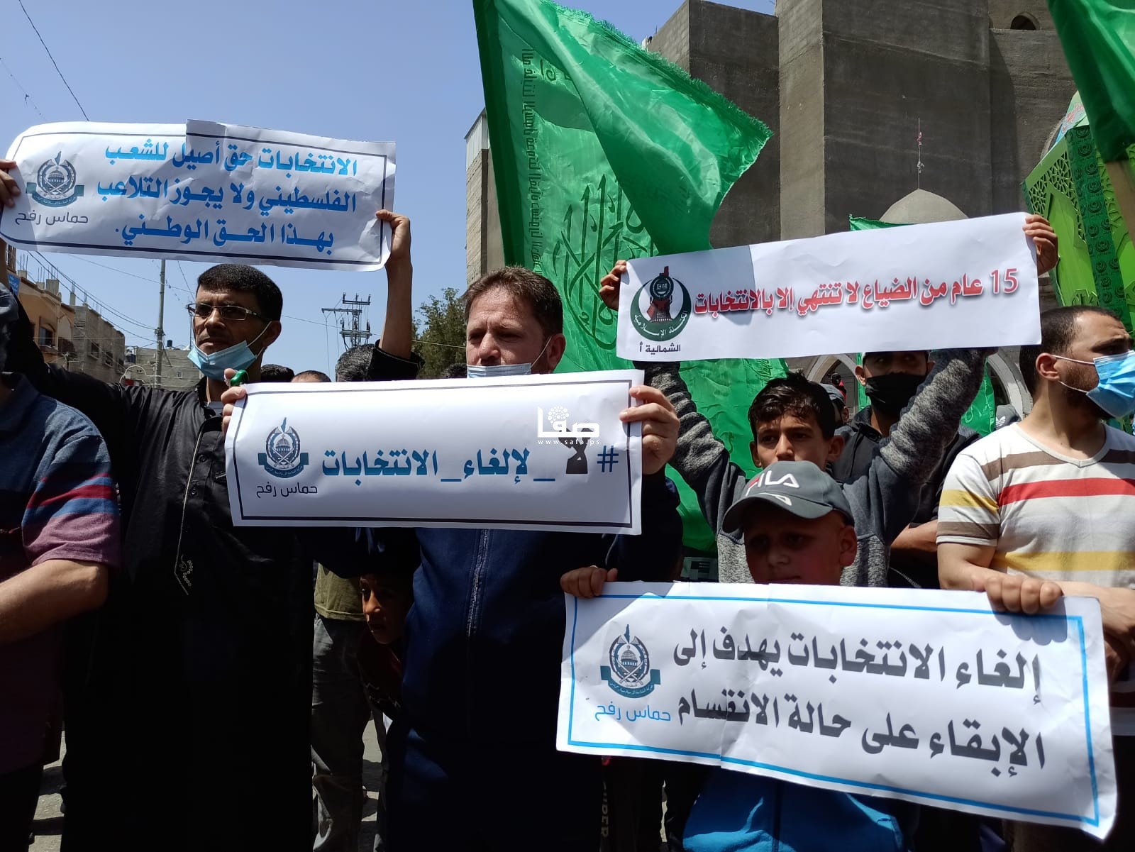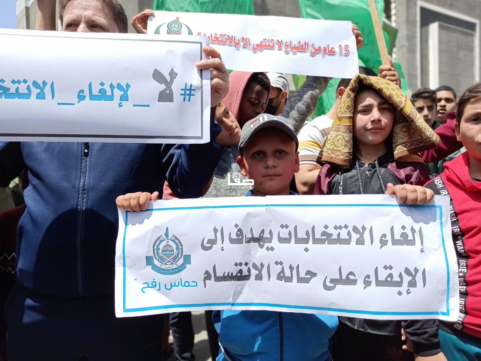 وفي محافظتي رفح وخان يونس؛ شارك المئات في وقفات، رافضة لتعطيل الانتخابات أمام المساجد، وفي الميادين العامة.