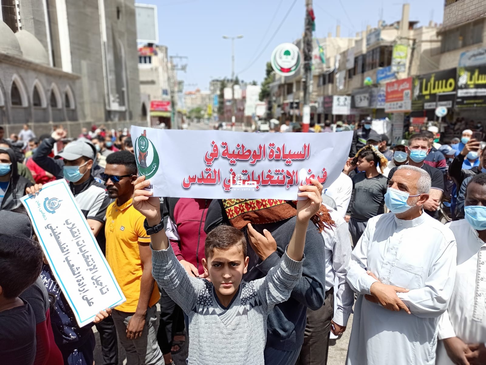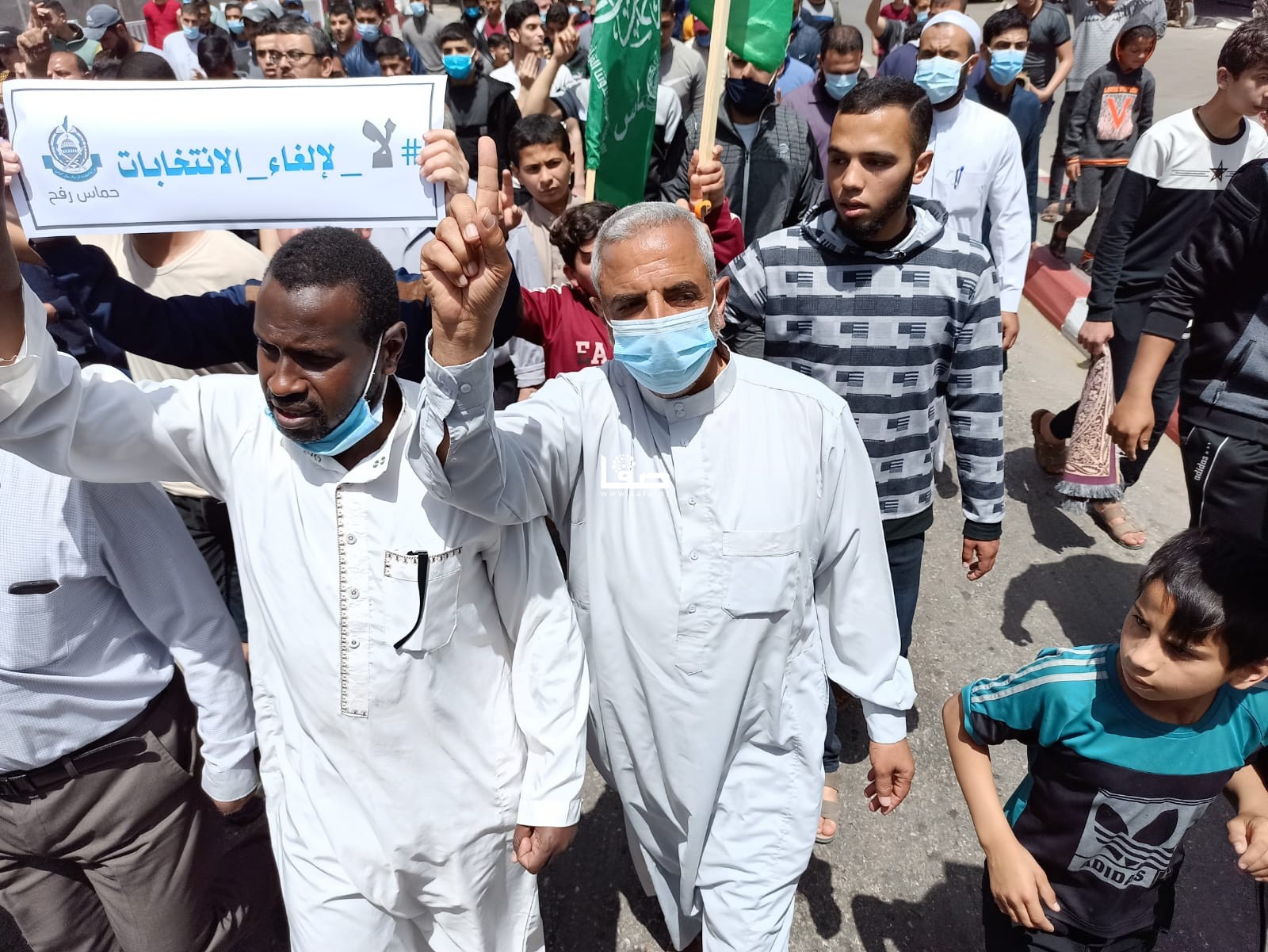 تظاهر الآلاف في قطاع غزة، ظهر يوم الجمعة، رفضًا لقرار الرئيس محمود عباس تعطيل الانتخابات الفلسطينية التي كان من المقرر أن تبدأ في 22 مايو/ أيار المقبل، وإسنادًا لمدينة القدس المحتلة.