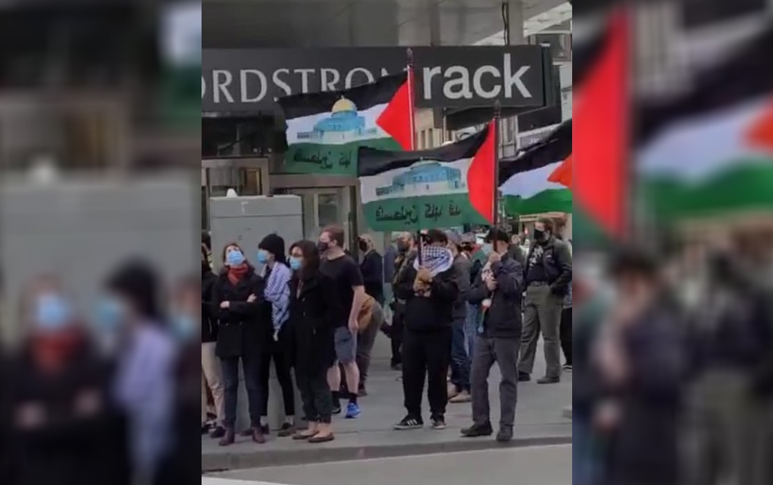 ورفع المتظاهرون الأعلام الفلسطينية وهتفوا بالحرية للشعب الفلسطيني ولفلسطين.