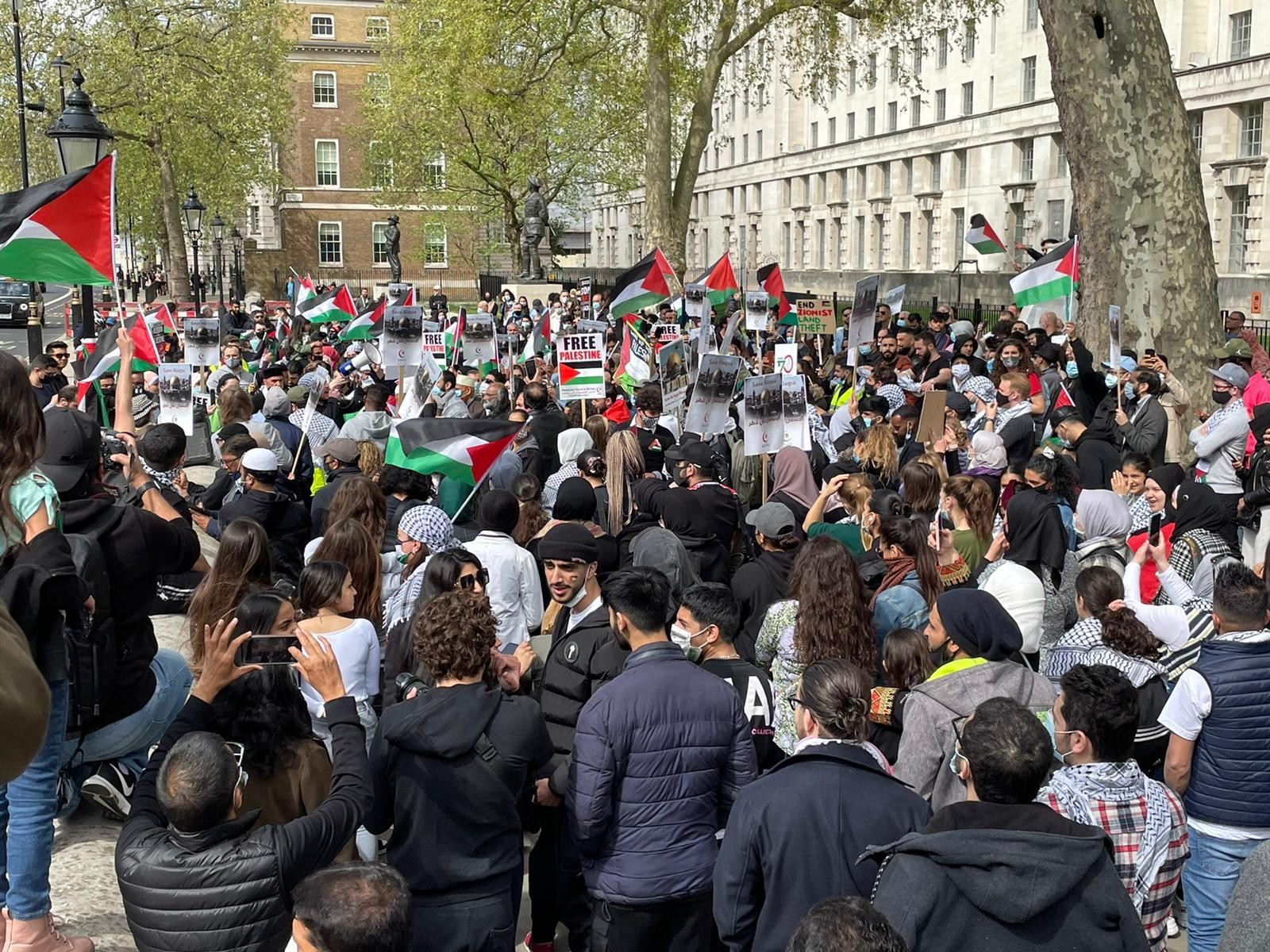ورفع المتظاهرون الأعلام الفلسطينية، ويافطات تندد بالاعتداءات الهمجية التي تنفذها المنظمات الصهيونية ضد الشعب الفلسطيني، الهادفة إلى إحداث نكبة فلسطينية جديدة بإخلاء ما يقارب العوائل الفلسطينية من حي الشيخ جراح في مدينة القدس المحتلة، وإقامة بؤرة استيطانية كبيرة، بهدف تنفيذ مخطط التهويد الكبير داخل مدينة القدس المحتلة.