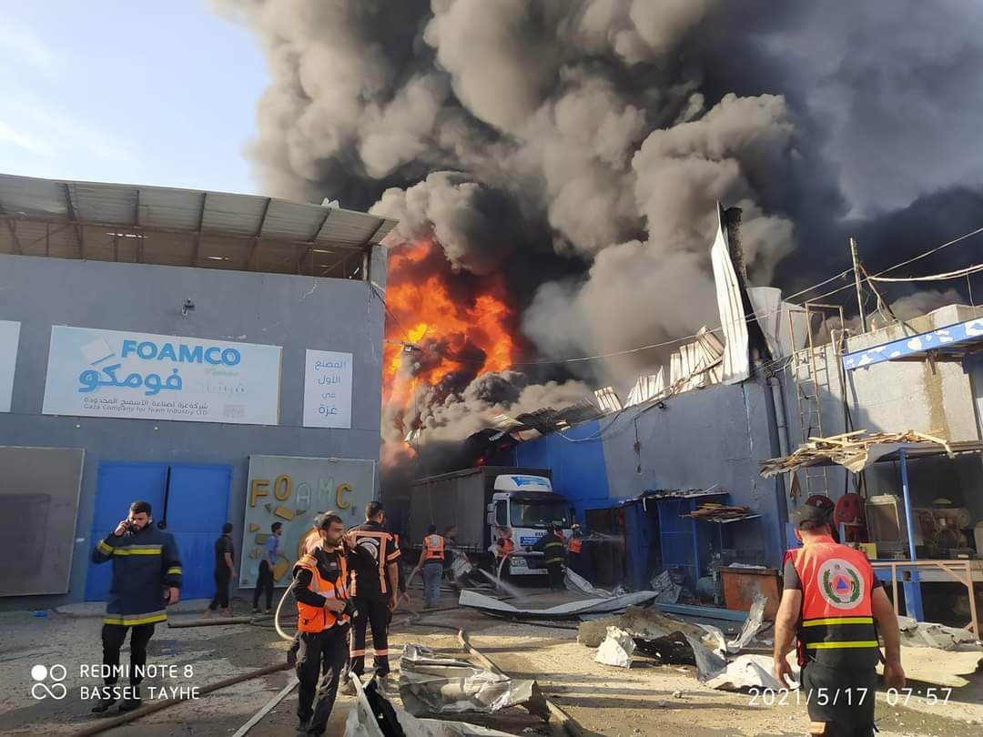 تسبب قصف إسرائيلي، صباح الإثنين، باندلاع حريق هائل في مصنع للإسفنج شمالي قطاع غزة، في وقت يعمل الدفاع المدني على إخماده.