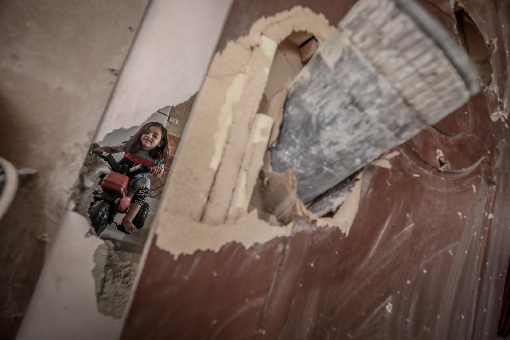 طفلة تلهو في غرفتها التي تعرضها للقصف بقذيفة إسرائيلية - تصوير: محمد أسعد