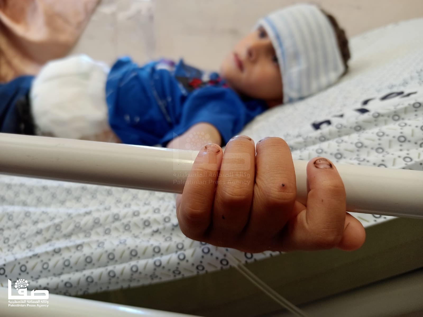 يمسك الطفل إبراهيم بيد والده خميس جنيد الذي يرافقه في رحلة علاجه مستلقيًا على ظهره ويئن من الألم وكلما على صوته من الألم طبطب الأب بيده على جسد نجله "شد حيلك يا بابا.. الله يشفيك يا بابا.."؛ واضعًا ضمادة مبللة على رأسه لخفض درجة سخونته.