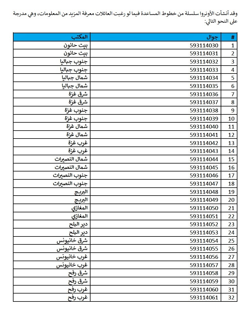 ونوهت "الأونروا" أنها أنشأت سلسلة من خطوط المساعدة فيما لو رغبت العائلات معرفة المزيد من المعلومات، وهي مدرجة حسب الصورة المرفقة.