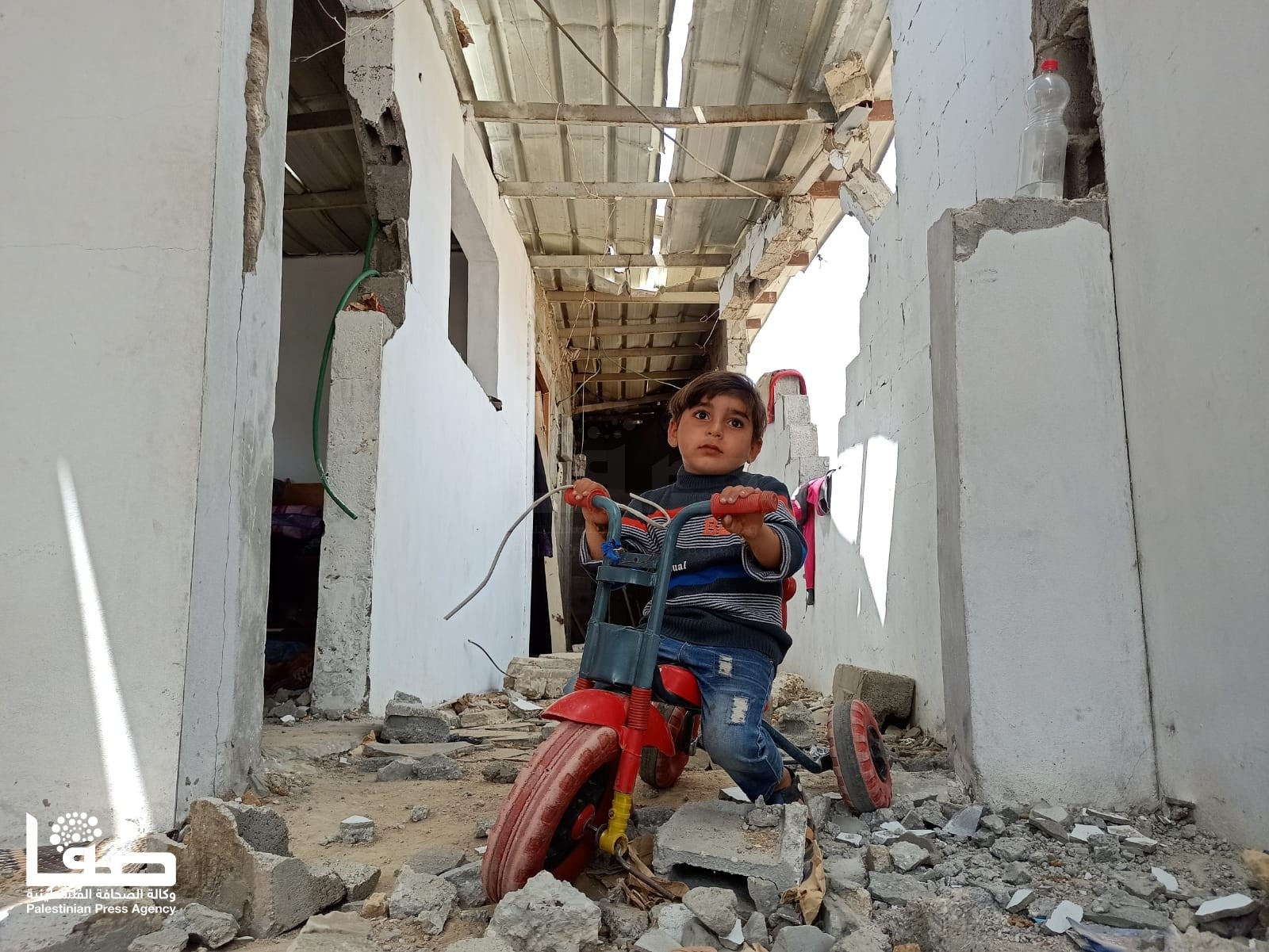 ويشير الكفارنة بيده المبتورة على طفله الصغير وهو جالسٌ على لعبته المحطمة بين الركام، قائلاً : "هذا الطفل حُرم من فرحة العيد، ومن لعبته التي يلعب بها أيضًا، فلم يرتدي حتى الملابس التي اشتريناها له!".