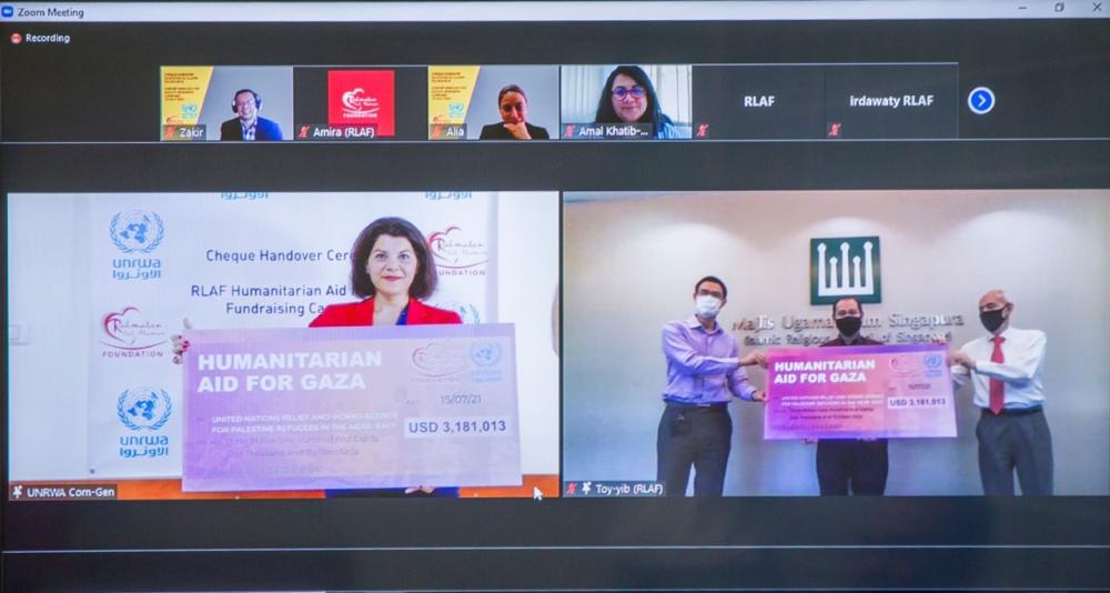 وأوضحت أن مديرة العلاقات الخارجية بالإنابة والمتحدثة الرسمية باسم الأونروا تمارا الرفاعي استلمت من الرئيس التنفيذي للمجلس الديني الإسلامي في سنغافورة عيسى مسعود، والرئيس التنفيذي لمؤسسة رحمة للعالمين فيصل عثمان، وفؤاد الشيخ أبو بكر مطر رئيس مجلس إدارة مؤسسة رحمة للعالمين خلال حفل افتراضي.