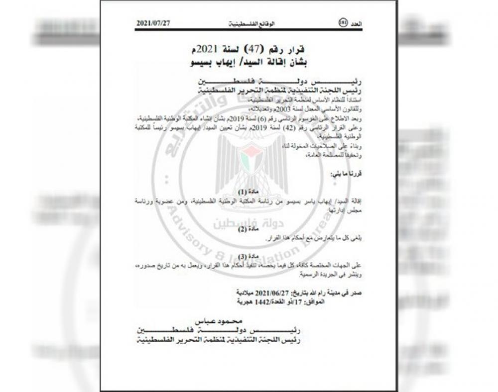 وصدر القرار من الرئيس محمود عباس "بناء على الصلاحيات المخولة لنا، وتحقيقا للمصلحة العامة، قررنا ما يلي إقالة السيد/ إيهاب ياسر بسيسو من رئاسة المكتبة الوطنية الفلسطينية ومن عضوية ورئاسة مجلس إدارتها".
