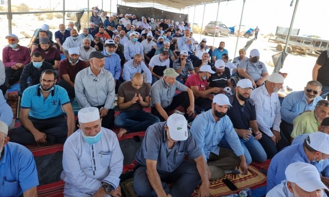 ورفع المشاركون في الصلاة صور الشيخ رائد صلاح ولافتات كتب عليها "لأجل الحق لن نلين".