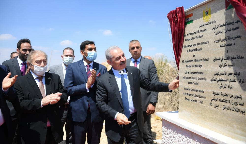 وضع رئيس الوزراء محمد اشتية يوم الثلاثاء شمال رام الله وسط الضفة الغربية المحتلة حجر الأساس لمركز تطوير المنتجات التراثية الفلسطينية "تراثي"، والممول من الحكومة الهندية.