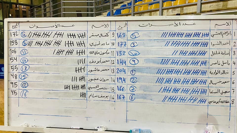 أسامة فلفل: (132) صوتًا، ومأمون ساق الله (106) صوتًا، ومنتصر الحسيني (95) صوتًا، ومحمد عاشور (55) صوتًا، ومحمد أبو دف (54) صوتًا، ومروان عجور (48) صوتًا، ويوسف فضل موسى (45) صوتًا.