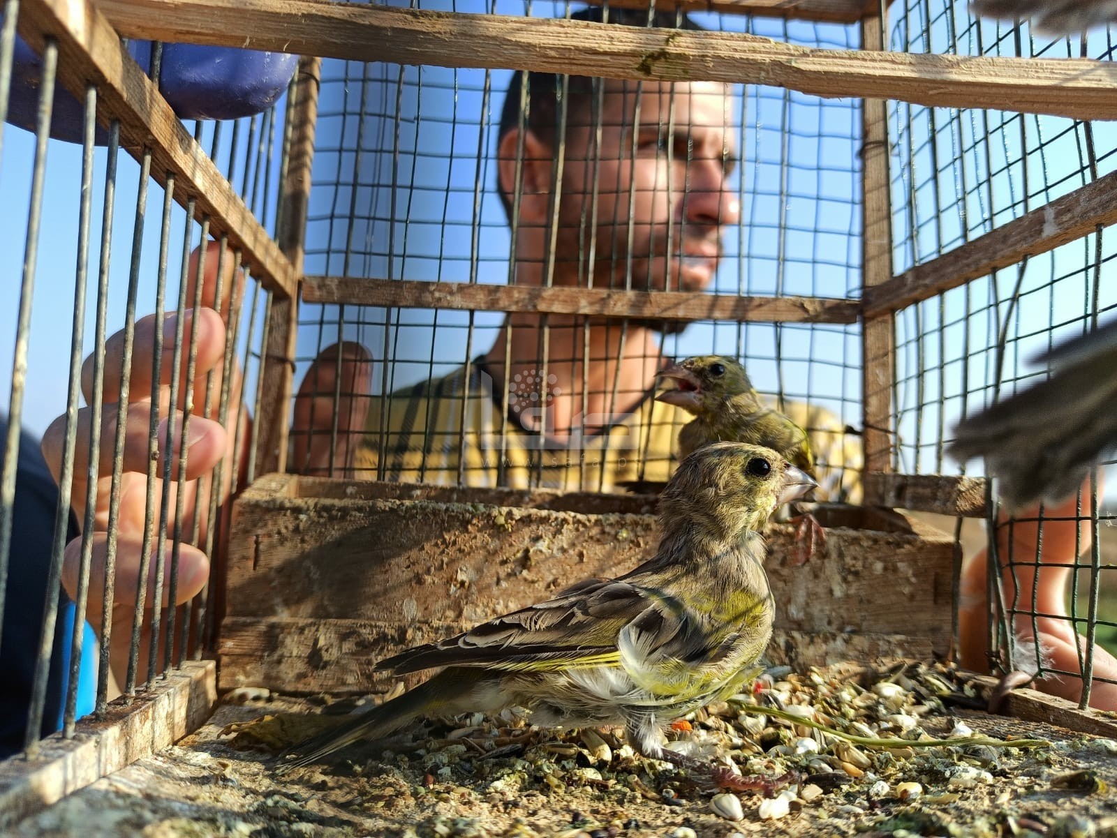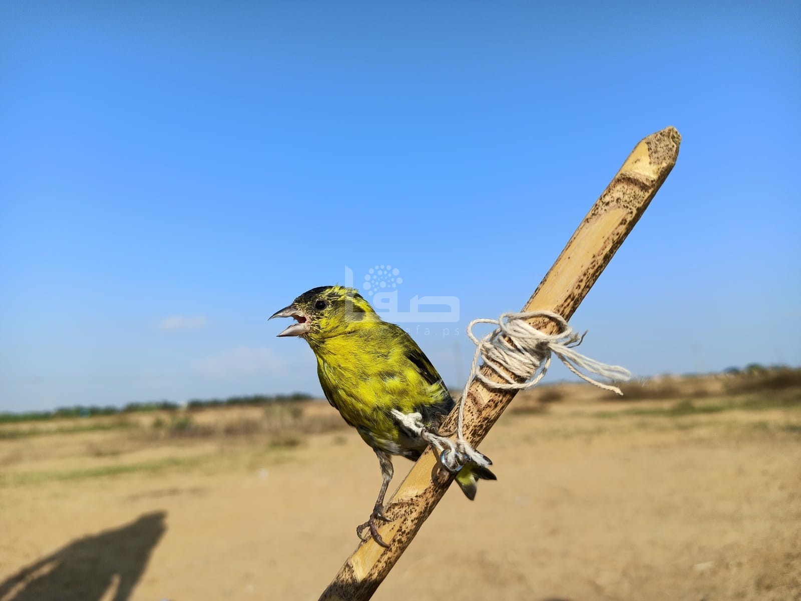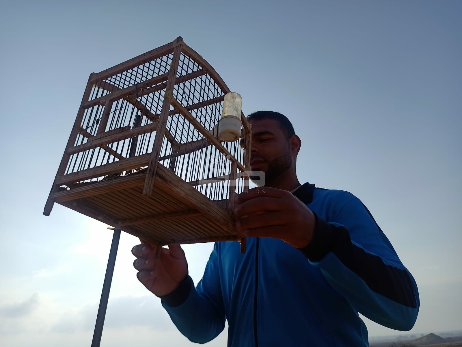 شبكة صيد "خالد" تجاورها أخرى، على قرابة 200 متر من السياج الأمني، تحيطها أقفاص معلق بداخلها أنواع مختلفة من العصافير ذات الصوت الجميل لجذب الطيور، فيما يقوم بتحريك عصى مثبتة في الأرض ومتصلة بحبل تسمى "الحريك"، للإيقاع بالطيور في شباكه.