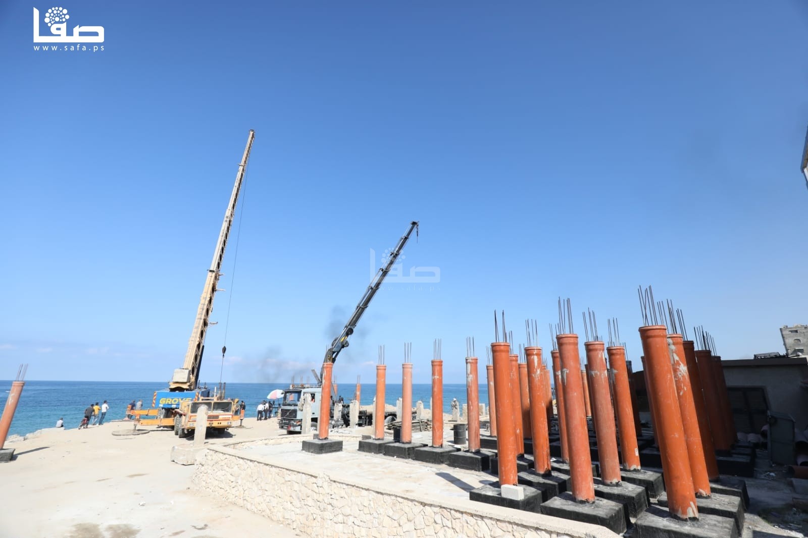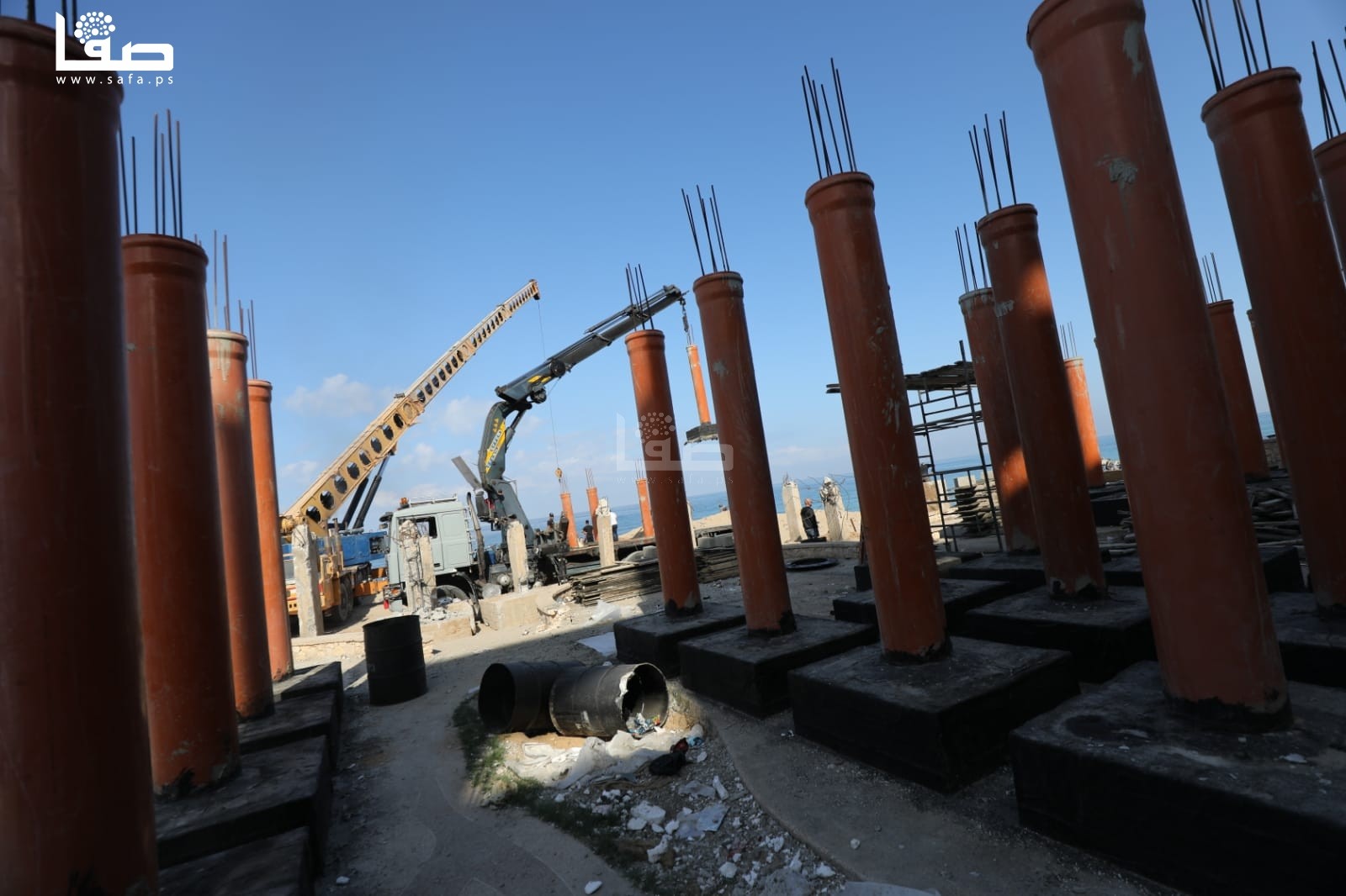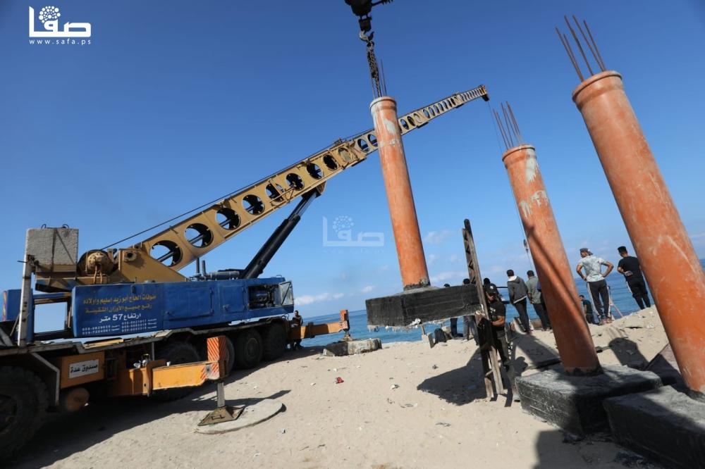 كما عمد المهندسون على تجهيز كواسر بحرية-مخلفات الابنية المدمرة من الحروب الإسرائيلية-قبالة المشروع للتخفيف من قوة الموج والرياح اثناء تثبيت قواعد المشروع.