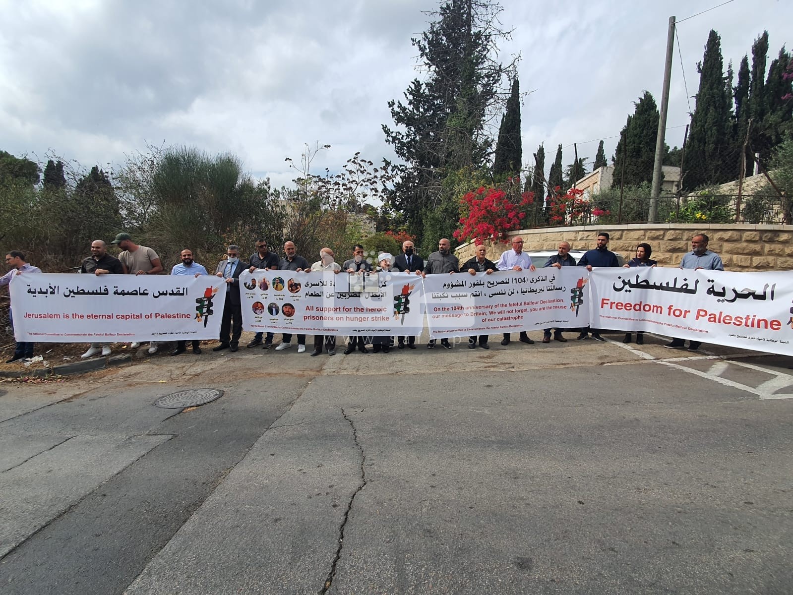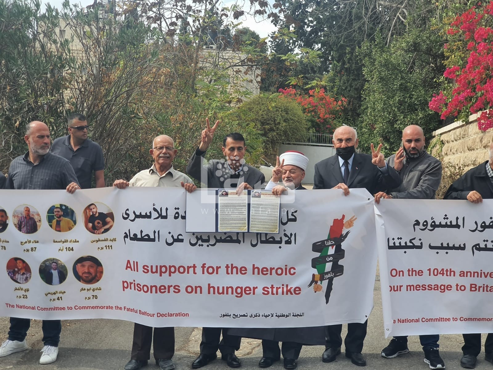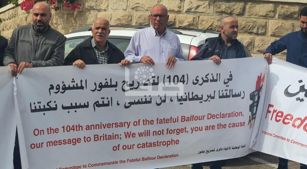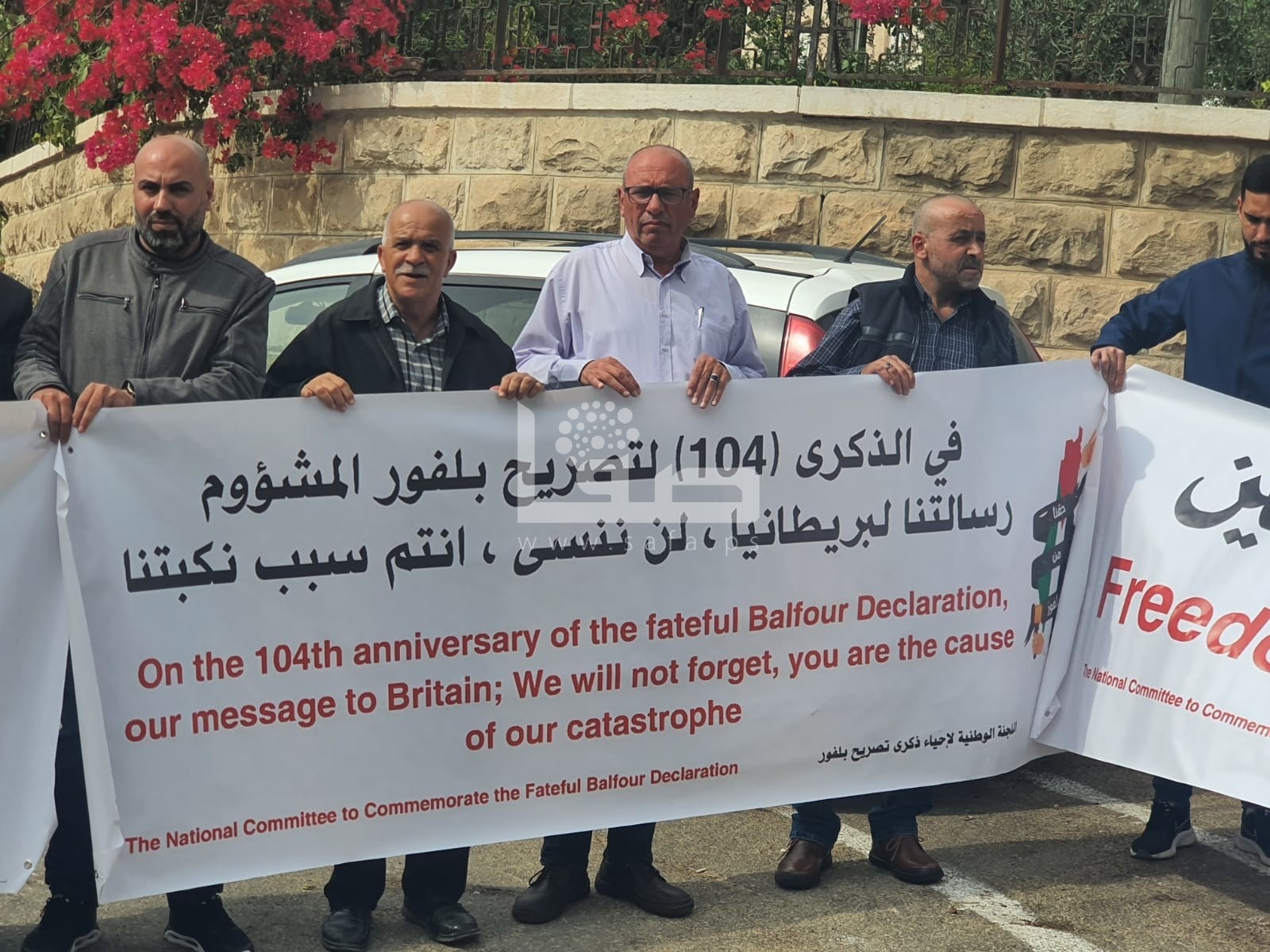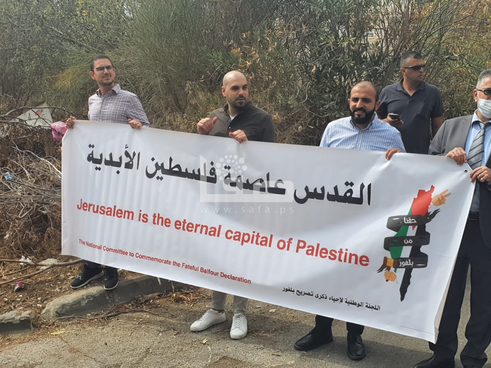 نظمت اللجنة الوطنية لإحياء ذكرى تصريح بلفور المشؤوم يوم الثلاثاء، اعتصامًا أمام القنصلية البريطانية في الشيخ جراح بالقدس المحتلة، تحت شعار "وعد باطل واحتلال زائل".