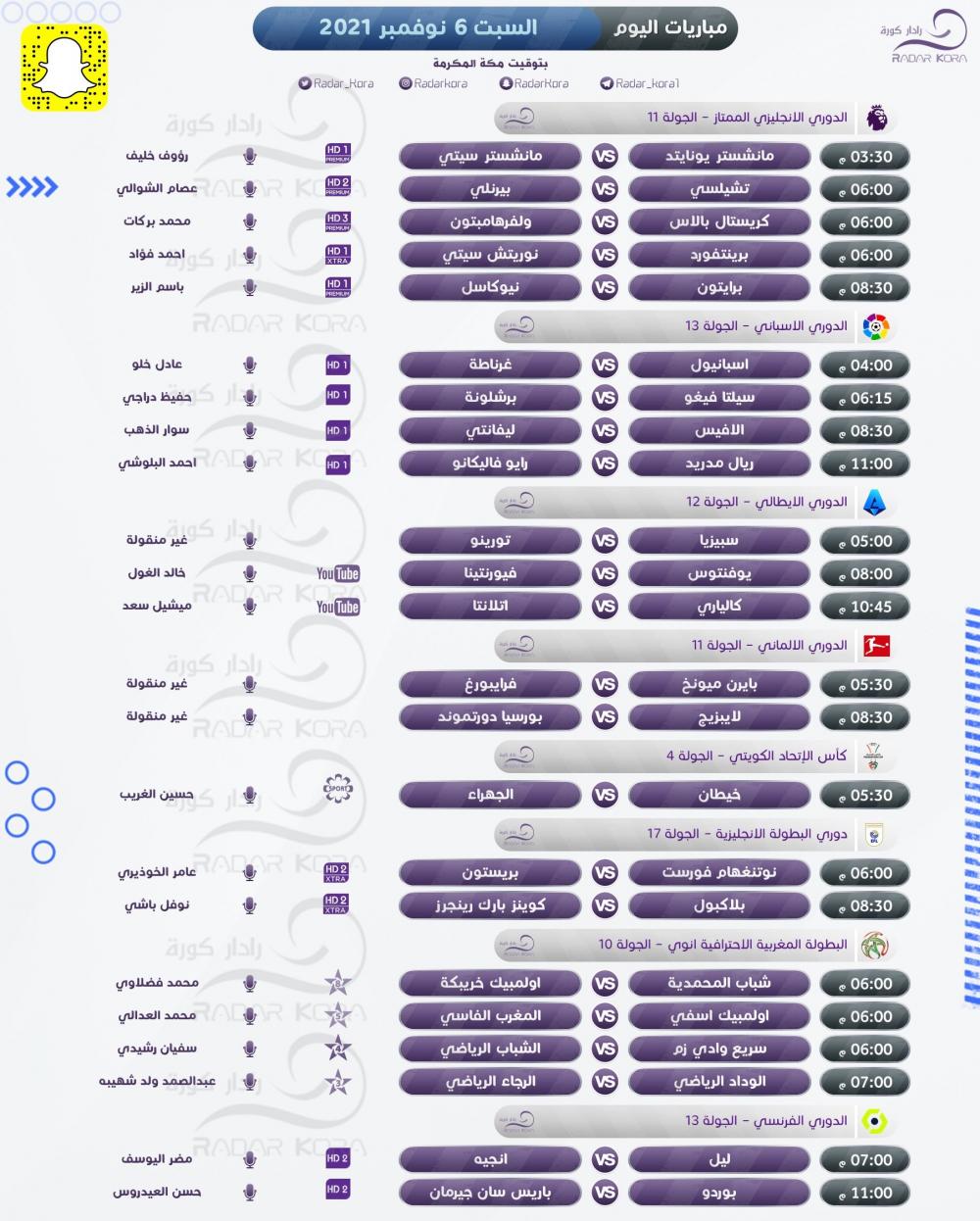 ويشهد الدوري الفرنسي في أسبوعه 13 مباراة بوردو مع باريس سان جيرمان، وفي مباراة قمة بالدوري المغربي، يلعب الوداد الرياضي مع الرجاء الرياضي بالجولة العاشرة من للبطولة.