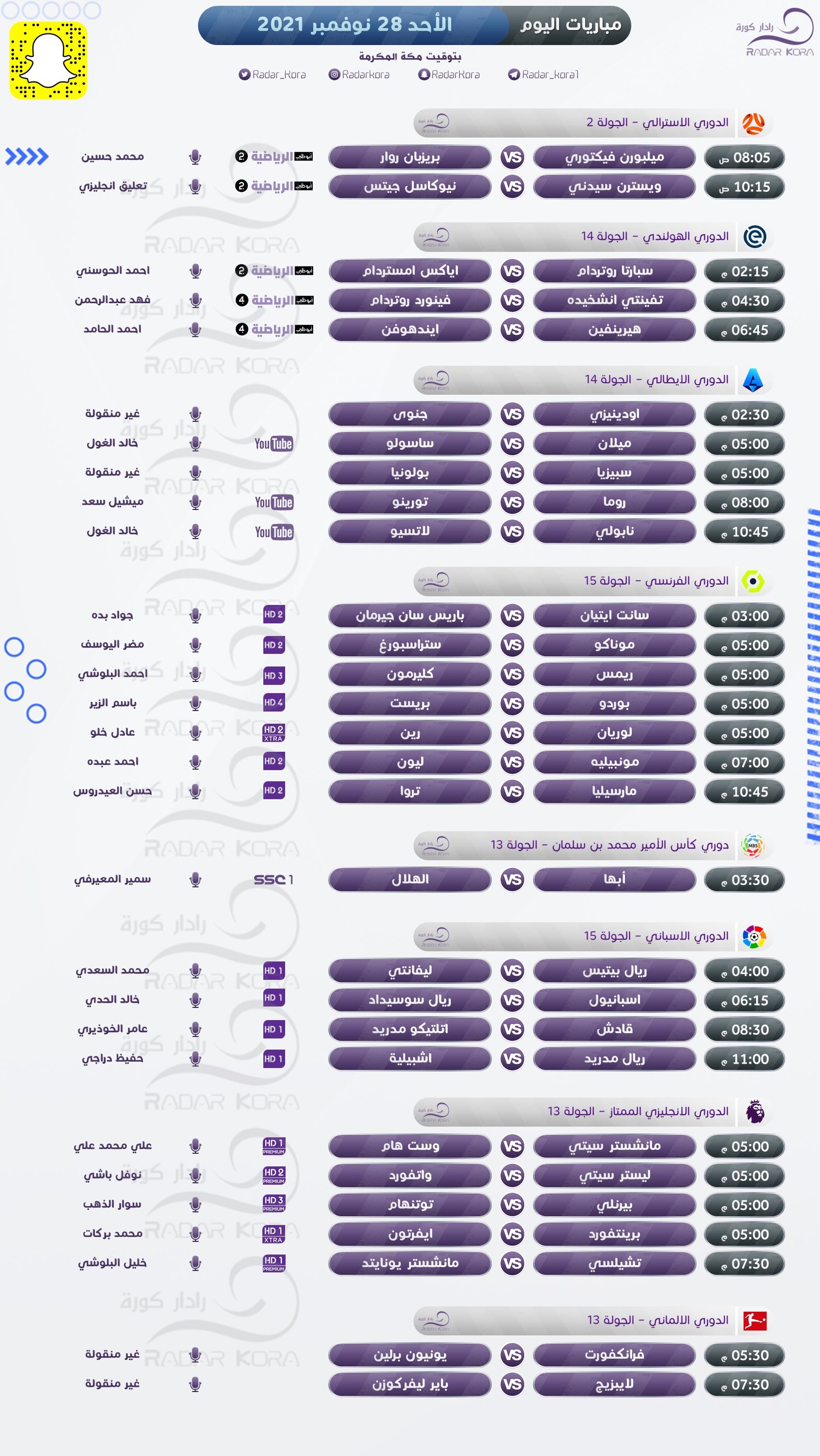 ويشهد الدوري الفرنسي بالجولة 15 مباراة سانت إيتيان مع باريس سان جيرمان، و مارسيليا مع تروا، وفي الأسبوع 13 من دوري كأس الأمير محمد بن سلمان بالسعودية يلعب أبها مع الهلال.