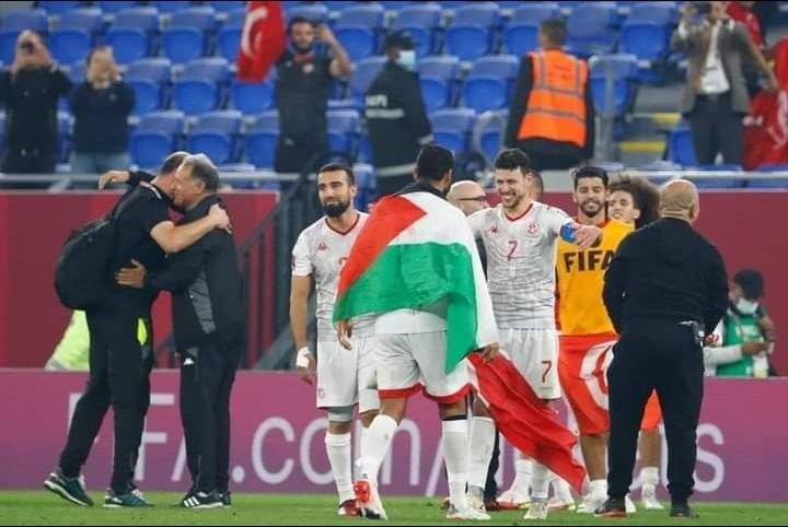 رفع نجوم منتخب تونس علم فلسطين خلال احتفالاتهم مساء الأربعاء بالفوز على مصر ضمن منافسات الدور نصف النهائي من بطولة كأس العرب لكرة القدم في قطر.