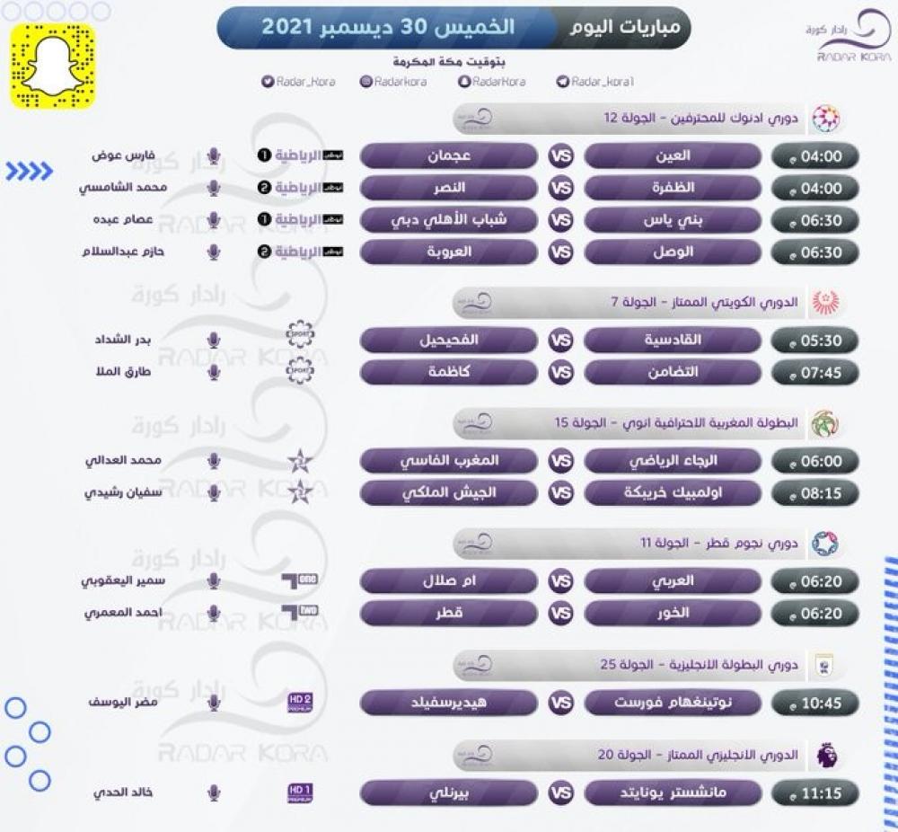 ويترقب عشاق الدوري الإنجليزي مباراة مانشستر يونايتد مع بيرنلي ضمن منافسات الجولة 20 من البطولة، وتبرز مباراة الوكرة مع السد من الأسبوع 11 لدوري نجوم قطر، وفي ذات البطولة يلعب الخور مع قطر، والعربي مع أم صلال.