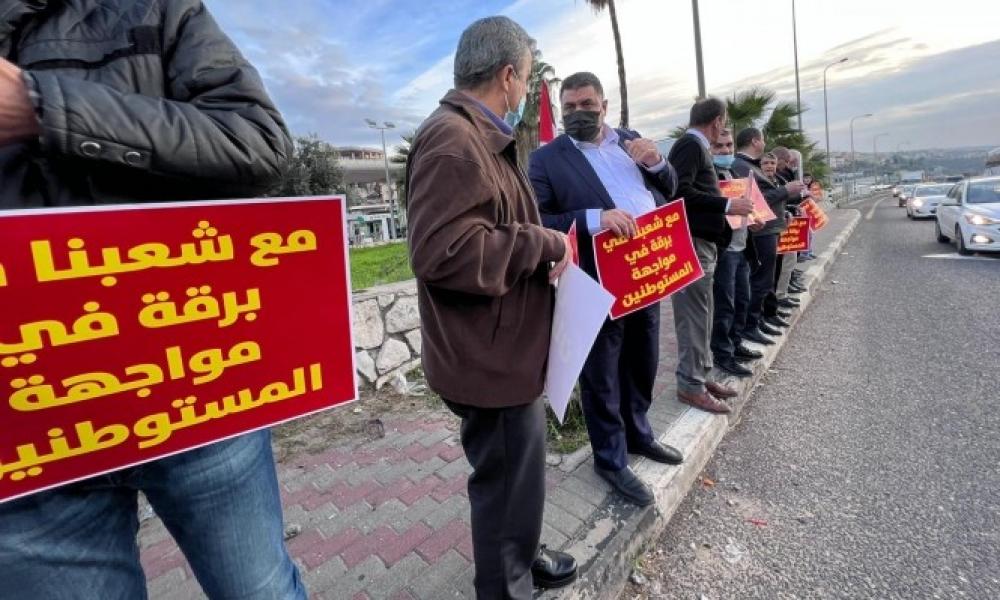 ورفع المشاركون لافتات مندّدة بإرهاب المستوطنين وتدعو إلى إسقاط الحكومة الإسرائيلية، وطالبوا من المؤسسات المدنية والشعبية "الوقوف وقفة واحدة للتصدي لهذه الهجمات".