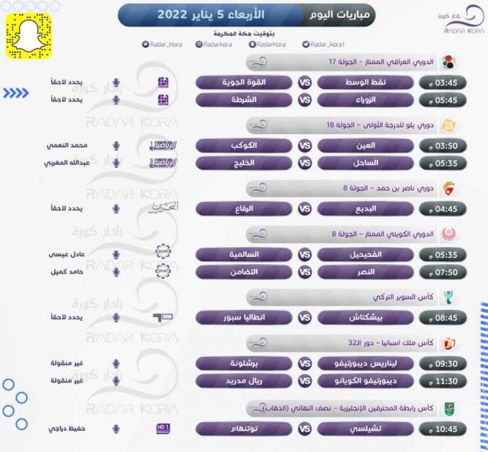 ويترقب عشاق كأس رابطة المحترفين الإنجليزية قمة تشيلسي مع توتنهام هوتسبير في الدور نصف النهائي من البطولة، وفي كأس ملك إسبانيا تبرز مباراة ديبورتيفو ألكويانو مع ريال مدريد في دور الـ 32 للمسابقة، وفي ذات البطولة يتقابل ليناريس ديبورتيفو مع برشلونة.