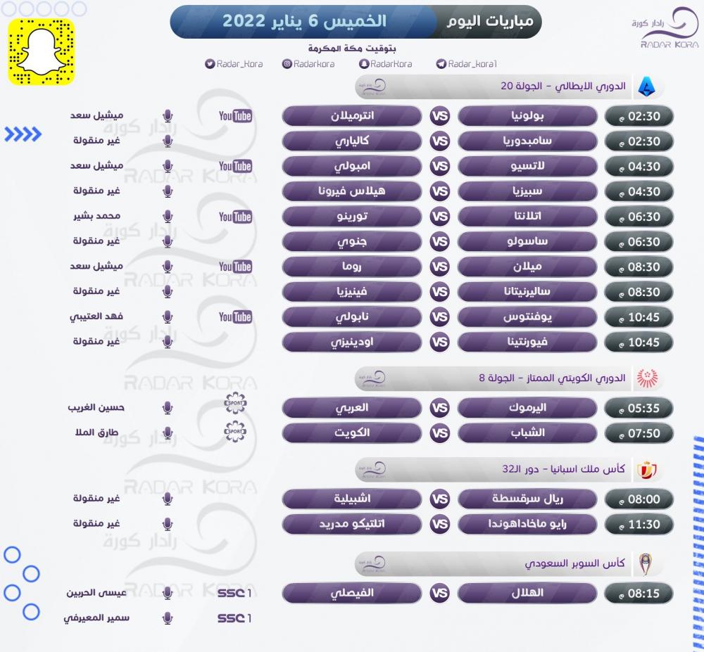وتعود عجلة الدوري الإيطالي للدوران بمباراة بولونيا مع إنتر ميلان ضمن منافسات الجولة 20 من البطولة، والتي تبرز فيها أيضًا لقاءات ميلان مع روما، ويوفنتوس مع نابولي، وفي دور الـ 32 من كأس ملك إسبانيا يتقابل رايو ماخاداهوندا مع أتلتيكو مدريد، وفي كأس السوبر السعودي يلعب الهلال مع الفيصلي.