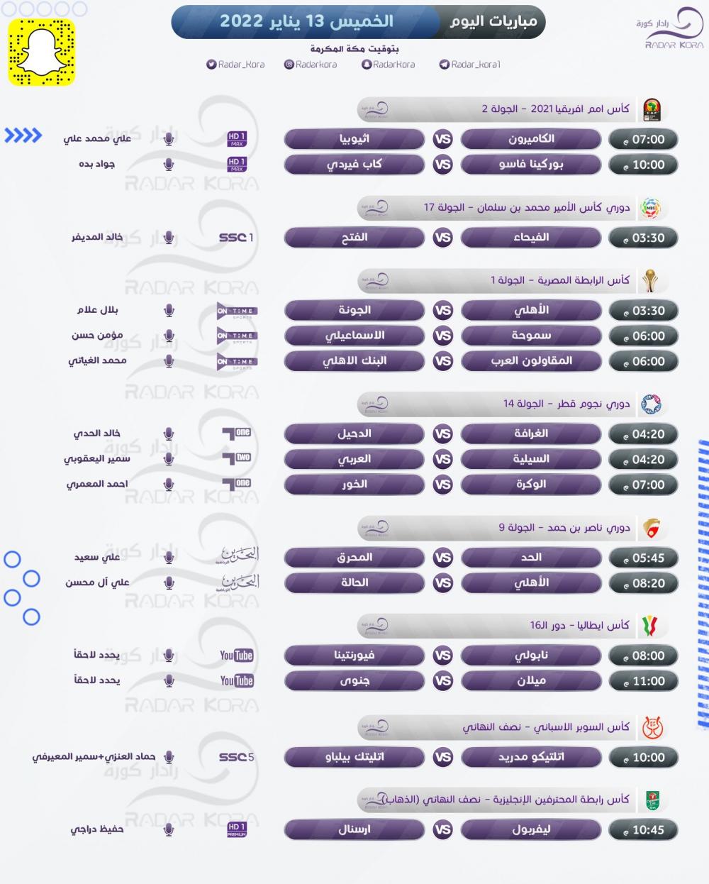 وتبرز مباراة أتلتيكو مدريد مع أتلتيك بيلباو في المباراة الثانية من نصف نهائي كأس السوبر الإسباني، وفي ذهاب نصف نهائي كأس رابطة المحترفين الإنجليزية تقام مباراة قمة نارية بين ليفربول وأرسنال، أما في دور الـ 16 من كأس إيطاليا يلعب نابولي مع فيورنتينا، وميلان مع جنوى، وفي النسخة الأولى من كأس الرابطة المصرية تلعب مباريات الأهلي مع الجونة، وسموحة مع الإسماعيلي، والمقاولون العرب مع البنك الأهلي.