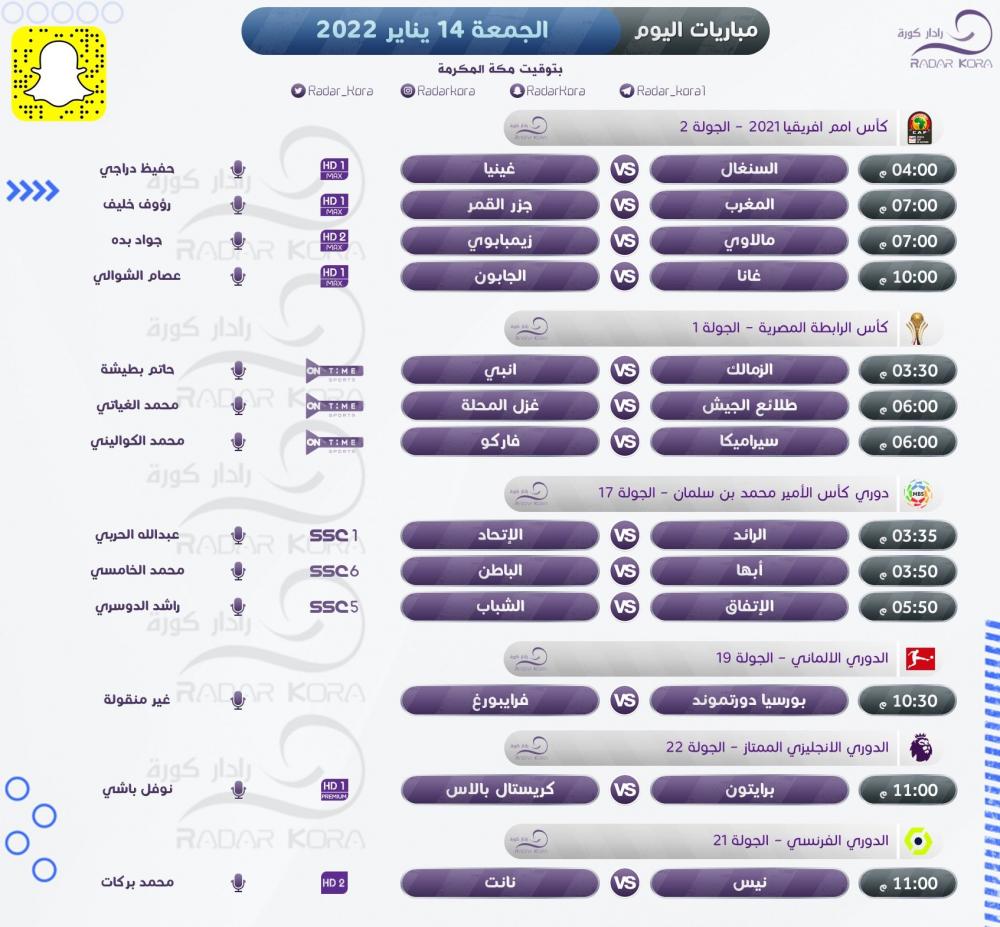 وفي الأسبوع 17 من دوري كأس الأمير محمد بن سلمان "الدوري السعودي للمحترفين" يلعب الرائد مع الاتحاد، وأبها مع الباطن، والاتفاق مع الشباب، وفي النسخة الأولى من كأس الرابطة المصرية تلعب مباريات الزمالك مع إنبي، وسيراميكا كليوباترا مع فاركو، وطلائع الجيش مع غزل المحلة.