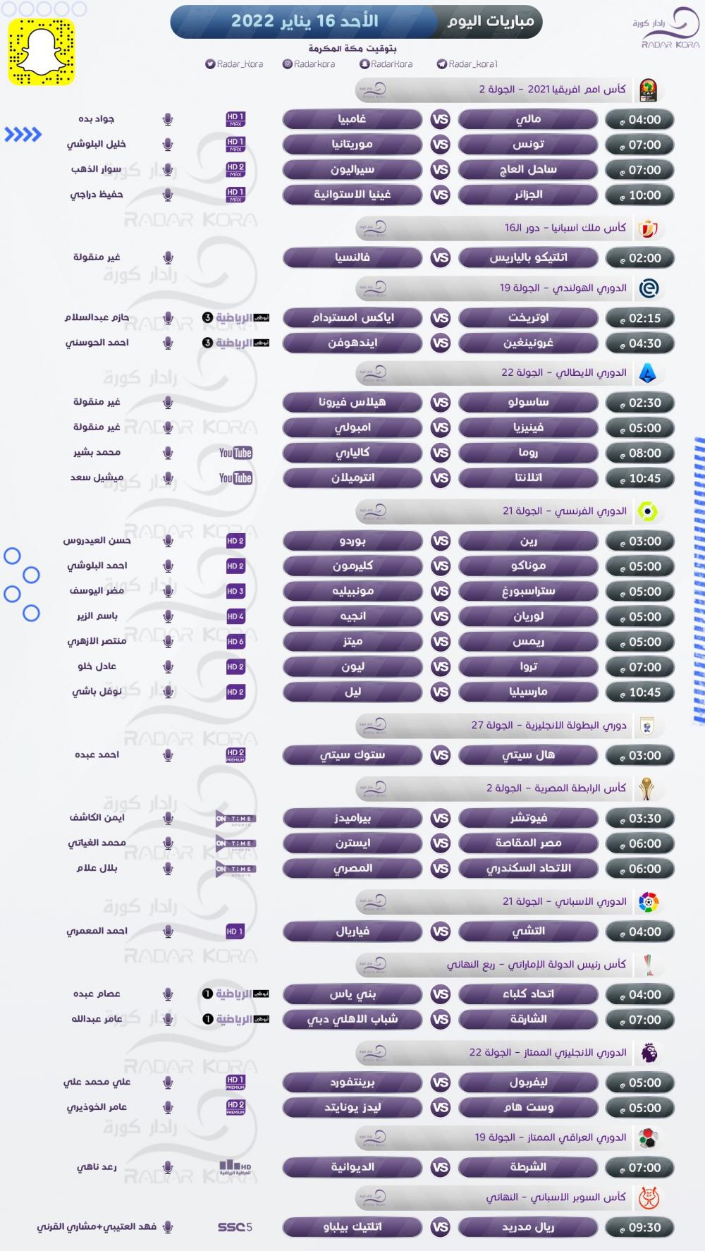 وفي نهائي كأس السوبر الإسباني يلعب أتلتيك بيلباو مع ريال مدريد، وفي الجولة الثانية من دور المجموعات لكأس الرابطة المصرية يتقابل فيوتشر مع بيراميدز، ومصر المقاصة مع إيسترن كومباني، والاتحاد السكندري مع المصري البور سعيدي.