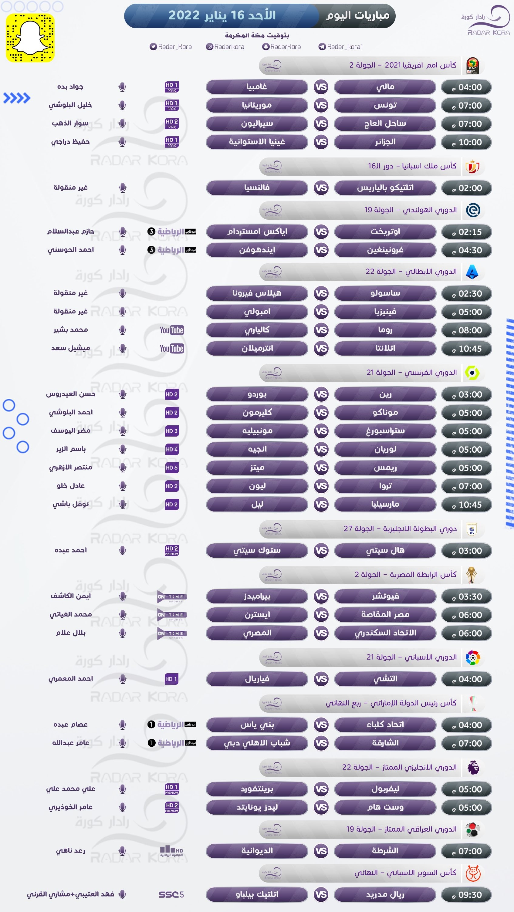 ويترقب عشاق الدوري الإنجليزي مباراة ليفربول مع برينتفورد ضمن الأسبوع 22 للمسابقة، أما في الدوري الإيطالي فتبرز مباراة أتلانتا مع إنتر ميلان في الجولة 22 للبطولة أيضًا، ويتقابل مارسيليا مع ليل بالأسبوع 21 من الدوري الفرنسي.