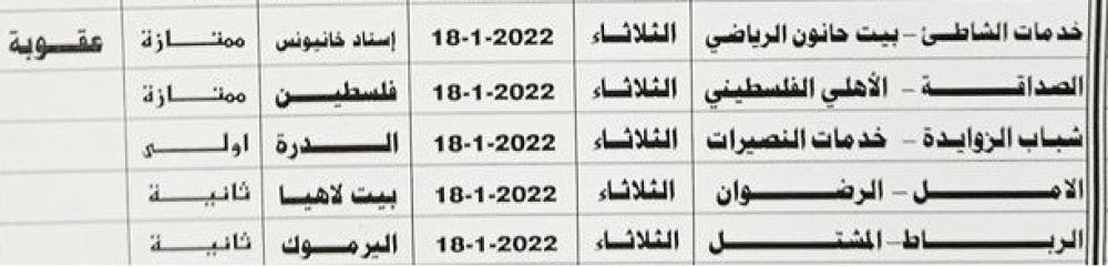 وفي أبرز المباريات يتقابل خدمات الشاطئ مع بيت حانون الرياضي، كما يلعب الصداقة مع أهلي غزة في الدرجة الممتازة، ويلتقي بالدرجة الأولى شباب الزوايدة مع جاره خدمات النصيرات.