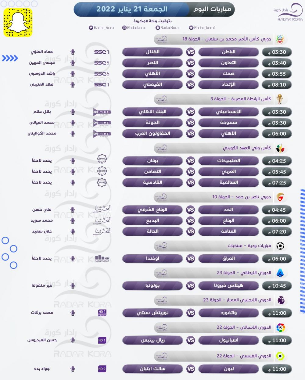 وتنطلق مباريات الجولة 22 من الدوري الفرنسي بلقاء ليون مع سانت إيتيان، وفي المرحلة 18 من دوري كأس الأمير محمد بن سلمان "الدوري السعودي للمحترفين" يلعب الاتحاد مع الفيصلي، والباطن مع الهلال، والتعاون مع النصر، وضمك مع الأهلي، أما في الجولة الثالثة من كأس الرابطة المصرية يتقابل الأهلي مع المقاولون العرب، والإسماعيلي مع البنك الأهلي، وسموحة مع الجونة.
