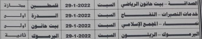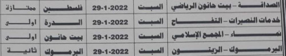 وفي أبرز المباريات يتقابل الصداقة مع بيت حانون الرياضي في الدرجة الممتازة، ونماء مع المجمع الإسلامي بالدرجة الأولى.