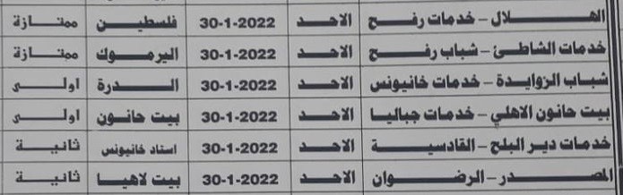 وفي أبرز المباريات يتقابل هلال غزة مع خدمات رفح، وخدمات الشاطئ مع شباب رفح في الدرجة الممتازة، وشباب الزوايدة مع خدمات خانيونس بالدرجة الأولى.