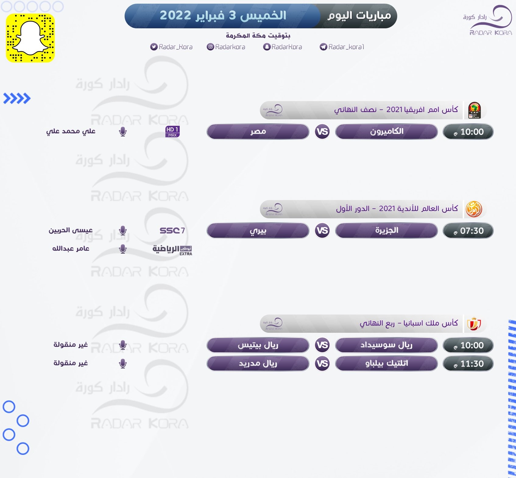 وتفتتح مباريات بطولة كأس العالم للأندية بمباراة الجزيرة الإماراتي مع بيري من تاهيتي، أما في الدور ربع النهائي من بطولة كأس ملك إسبانيا فيلعب أتلتيك بيلباو مع ريال مدريد، وريال سوسييداد مع ريال بيتيس.