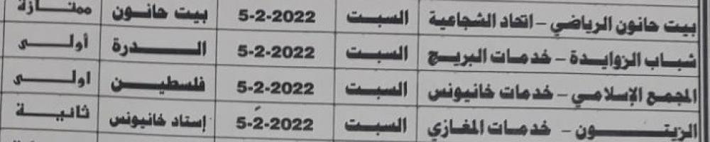 وفي أبرز المباريات يتقابل بيت حانون الرياضي مع اتحاد الشجاعية في الدرجة الممتازة، وشباب الزوايدة مع خدمات البريج بالدرجة الأولى.