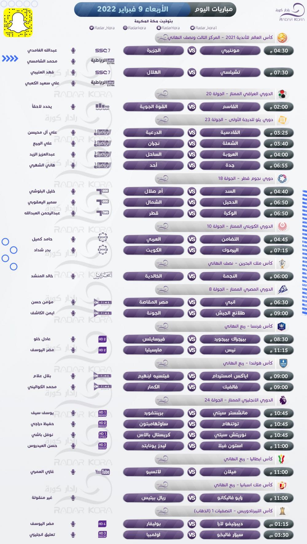 وتبرز مباراة تشيلسي الإنجليزي مع الهلال السعودي في الدور نصف النهائي من بطولة كأس العالم للأندية بالإمارات، كما يتقابل مونتيري المكسيكي مع الجزيرة الإماراتي بمباراة تحديد المركز الهامس في ذات البطولة.