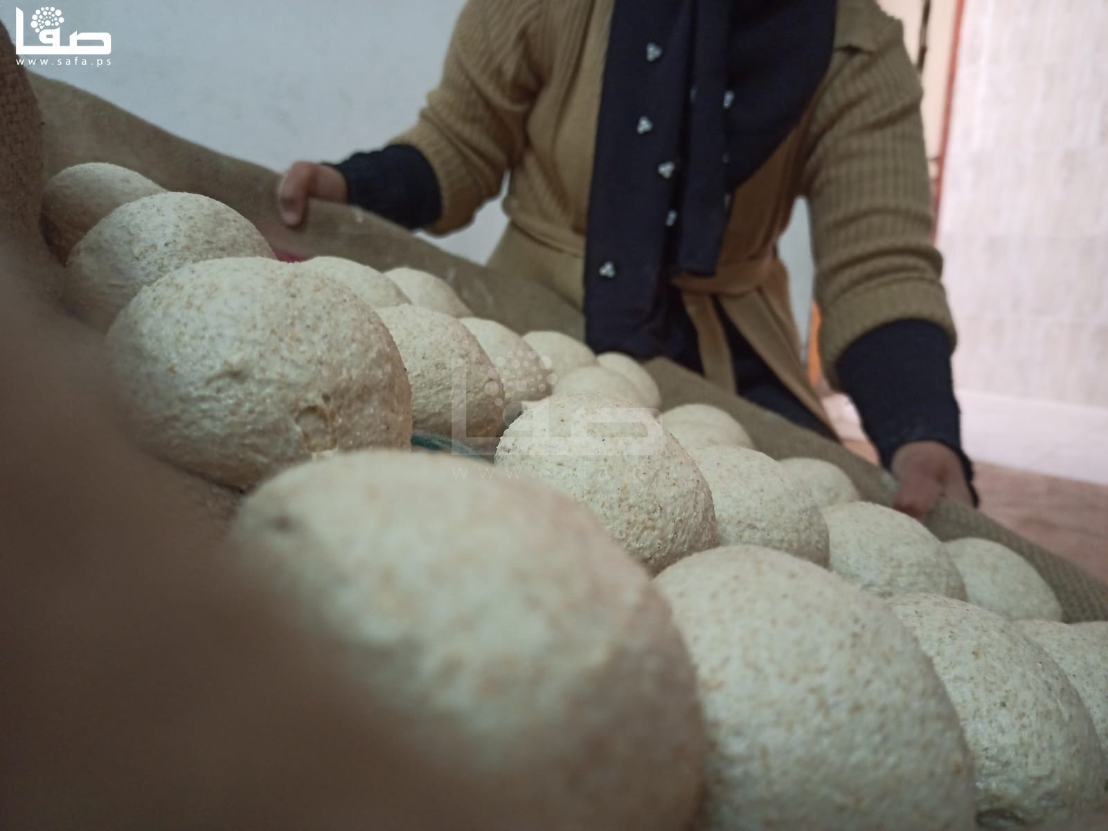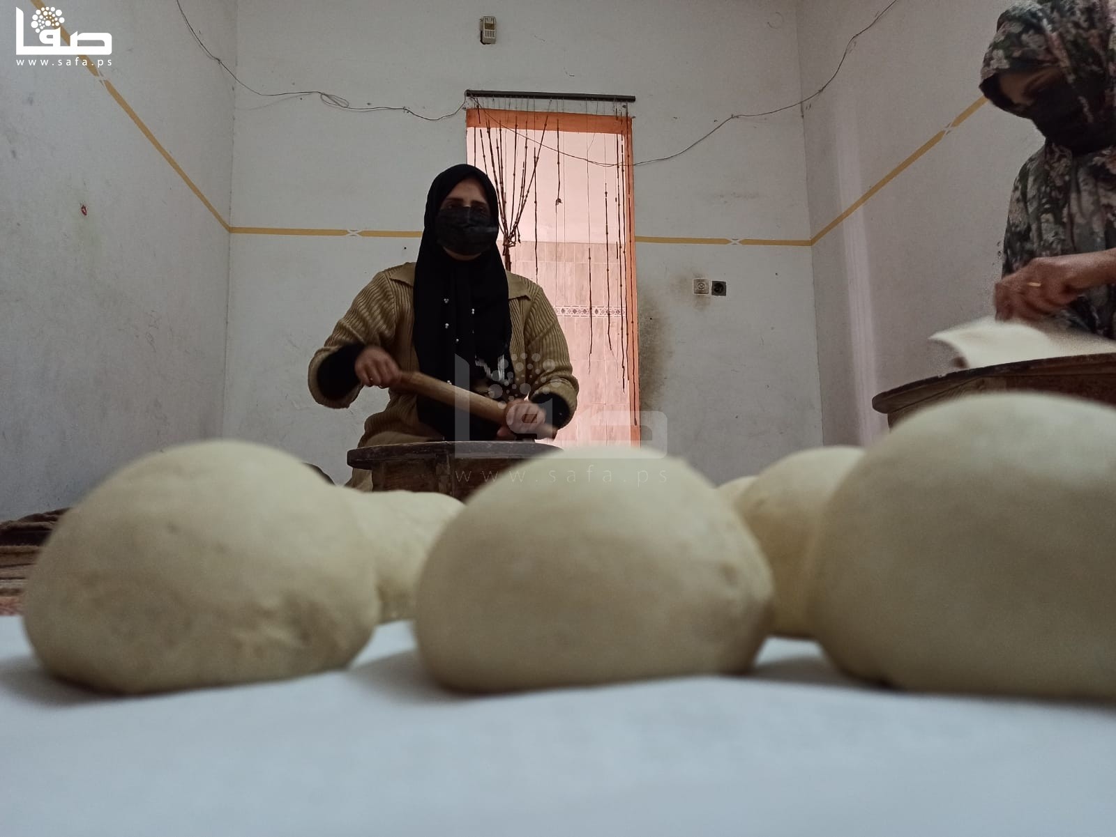 سجود قديح (29 عامًا) وقريبتها رغد (40 عامًا) هما أمان لأربعة أطفال لك منهما؛ تستفيقان مع بزوغ شمس كل صباح، لتحضير كمية العجين المطلوبة يدويًا داخل أوانٍ وتعجناه حتى يصبح جاهزًا للتقطيع والخبز.
