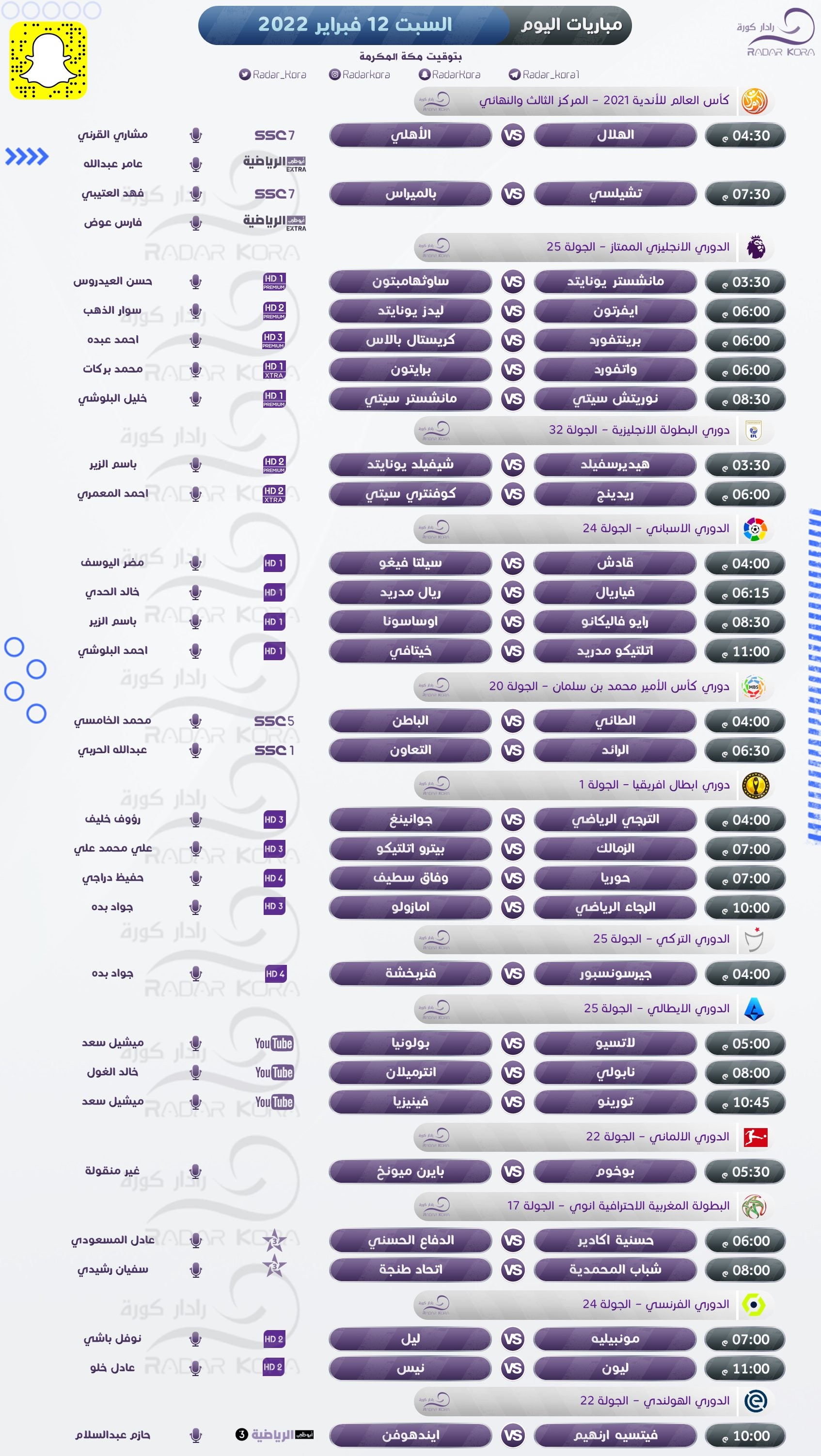 وتبرز مباراة تشيلسي الإنجليزي مع بالميراس البرازيلي في نهائي بطولة كأس العالم للأندية المقامة حاليًا في الأمارات، كما تجمع مباراة تحديد المركز الثالث الهلال السعودي بنظيره الأهلي المصري.