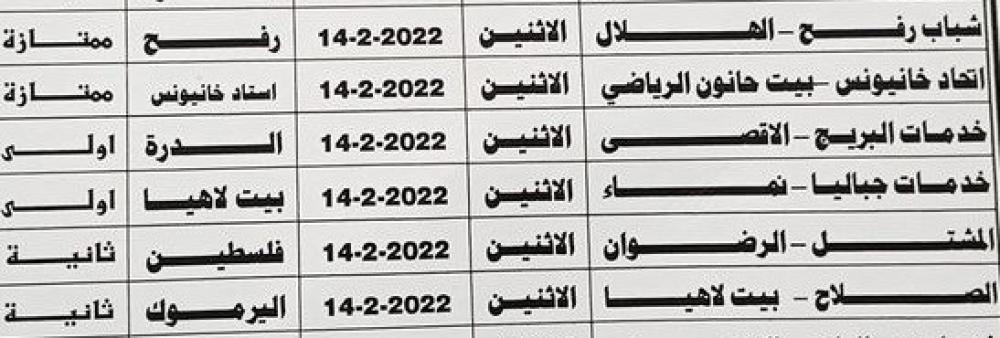 وفي أبرز المباريات، يتقابل شباب رفح مع هلال غزة، واتحاد خانيونس مع بيت حانون الرياضي في الدرجة الممتازة.