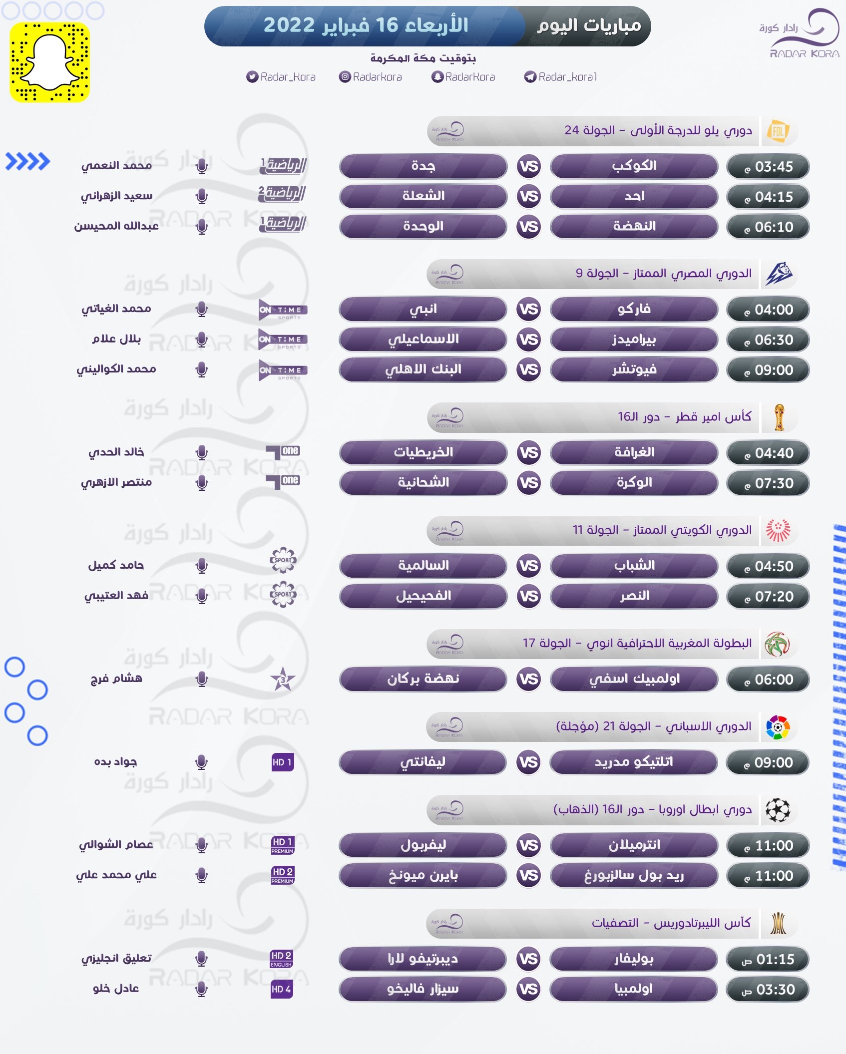 وفي الدوري الإسباني يلعب أتلتيكو مدريد مع ليفانتي في لقاء مؤجل من الأسبوع 21 للبطولة، أما بالدوري المصري فيلعب بيراميدز مع الإسماعيلي، وفيوتشر مع البنك الأهلي، وفاركو مع إنبي بالجولة التاسعة للمسابقة.