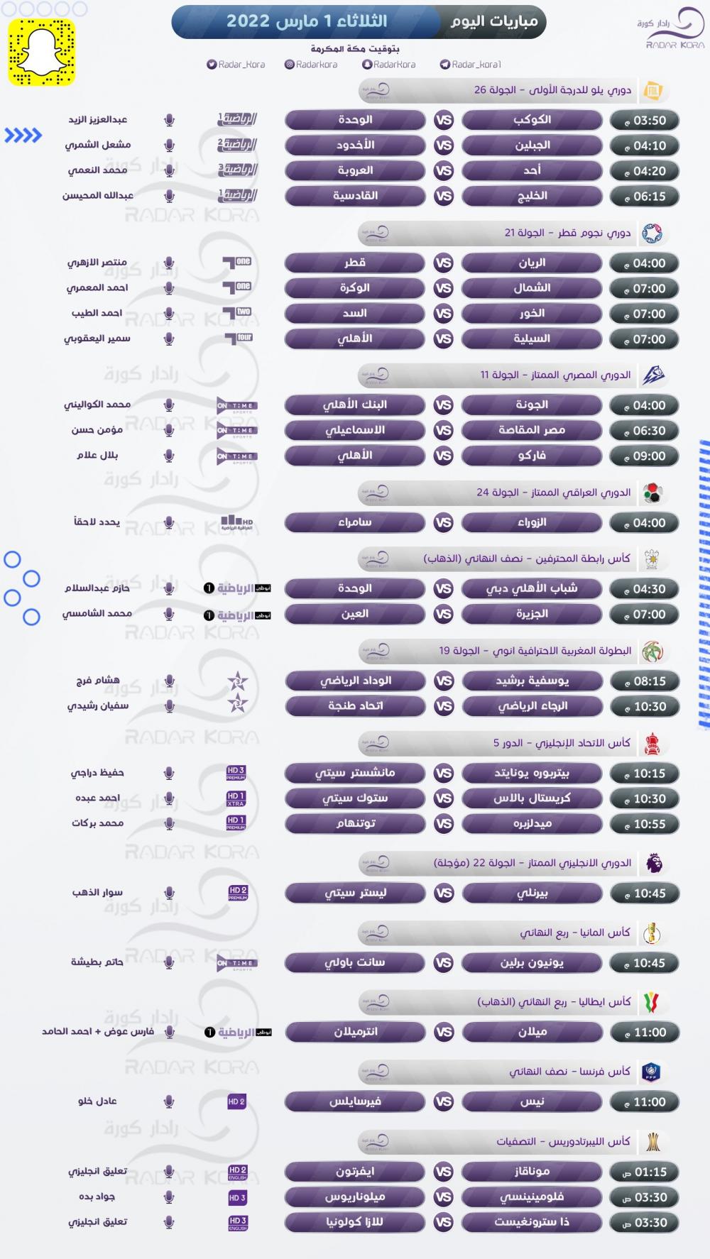 تتجه أنظار عشاق كرة القدم اليوم الثلاثاء لعدة مباريات في البطولات الأوروبية، والعربية المختلفة.