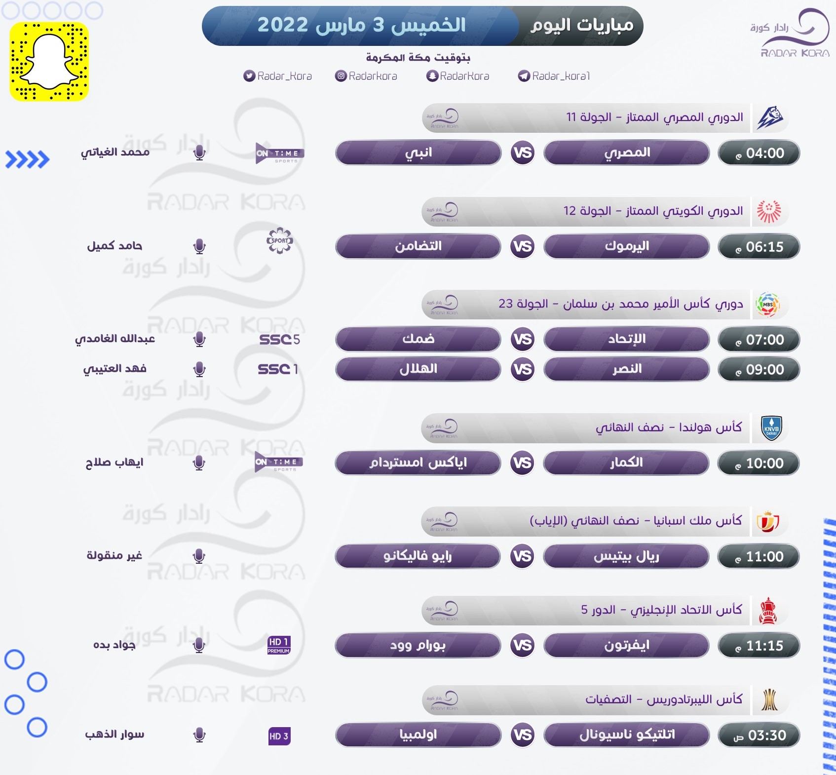 وتبرز في الدور الخامس من كأس الاتحاد الإنجليزي مباراة إيفرتون مع بورام وود، وفي الأسبوع 11 من الدوري المصري الممتاز يلعب المصري البور سعيدي مع إنبي، وتشهد الجولة 23 من دوري كأس الأمير محمد بن سلمان (الدوري السعودي للمحترفين) لقاء النصر مع الهلال، والاتحاد مع ضمك.