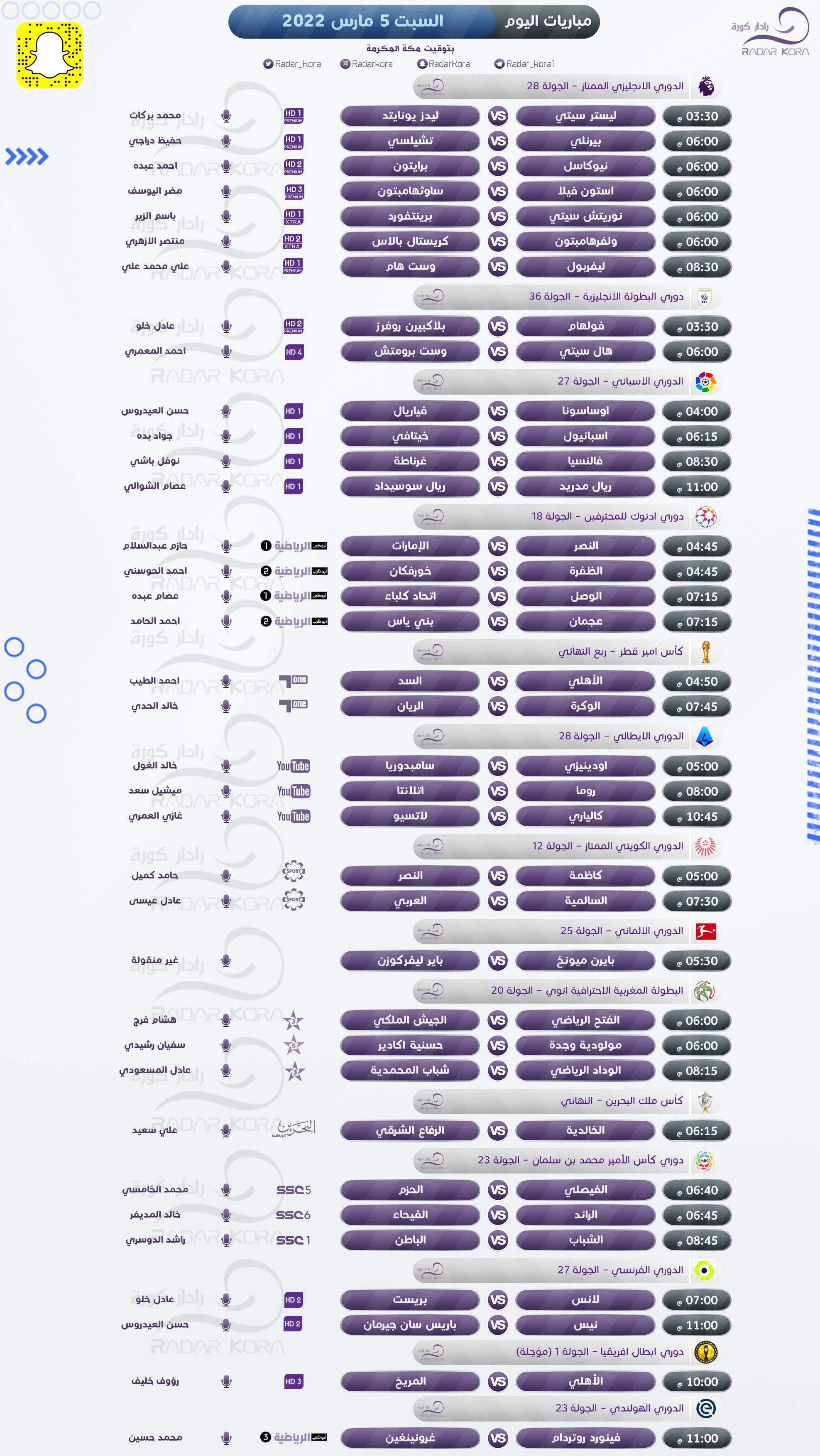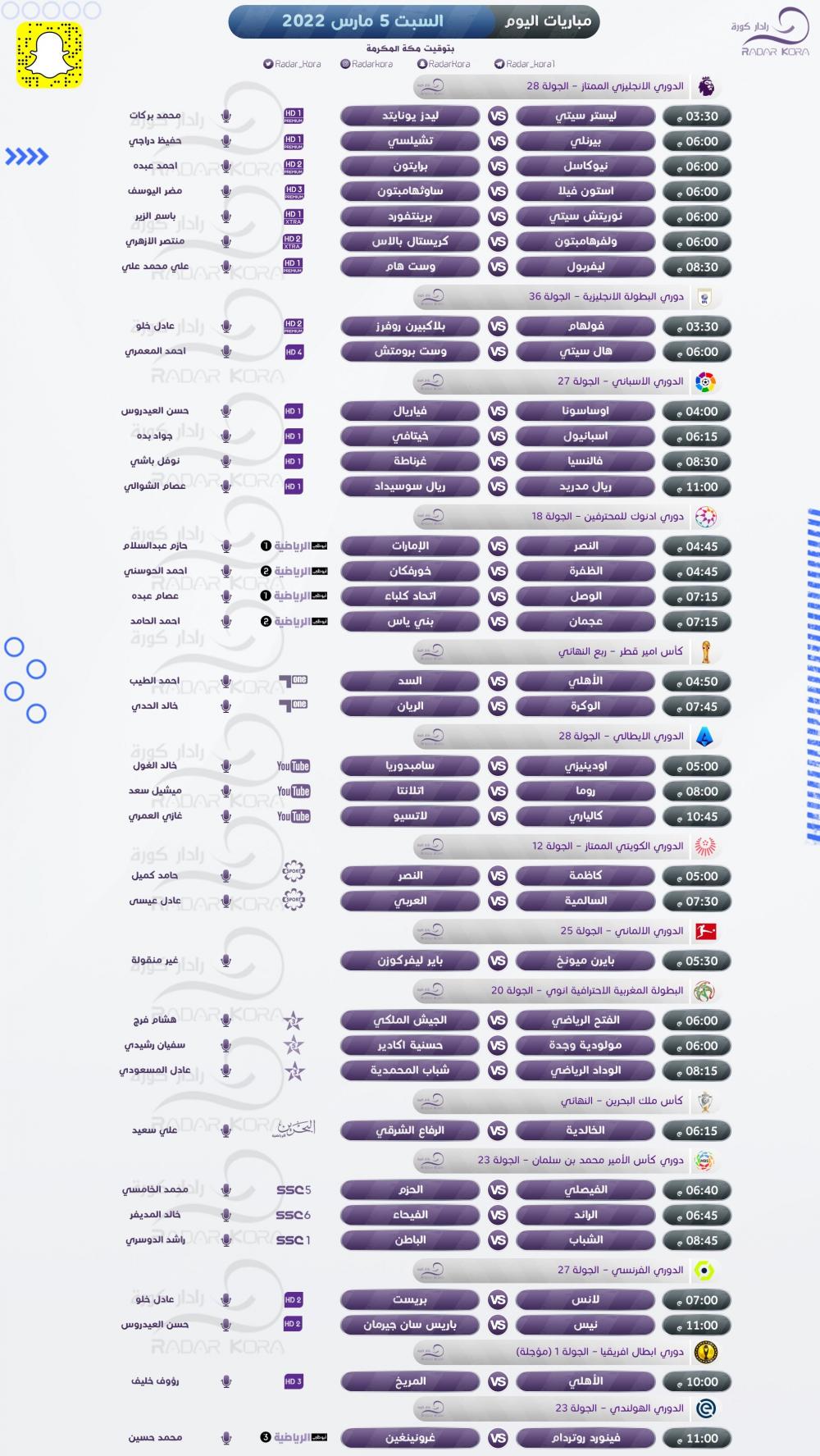 تتجه أنظار عشاق كرة القدم اليوم السبت لعدة مباريات في الدوريات الأوروبية، والعربية، وأبطال إفريقيا.