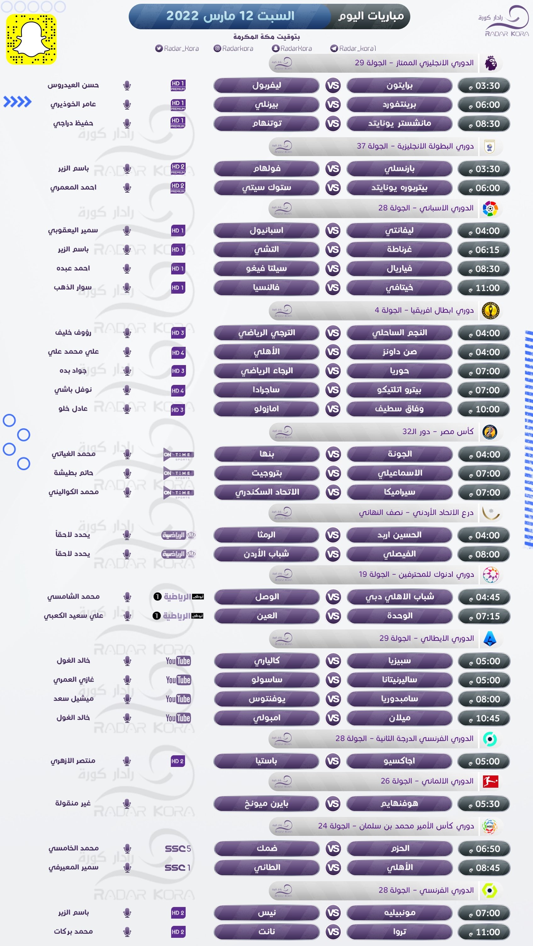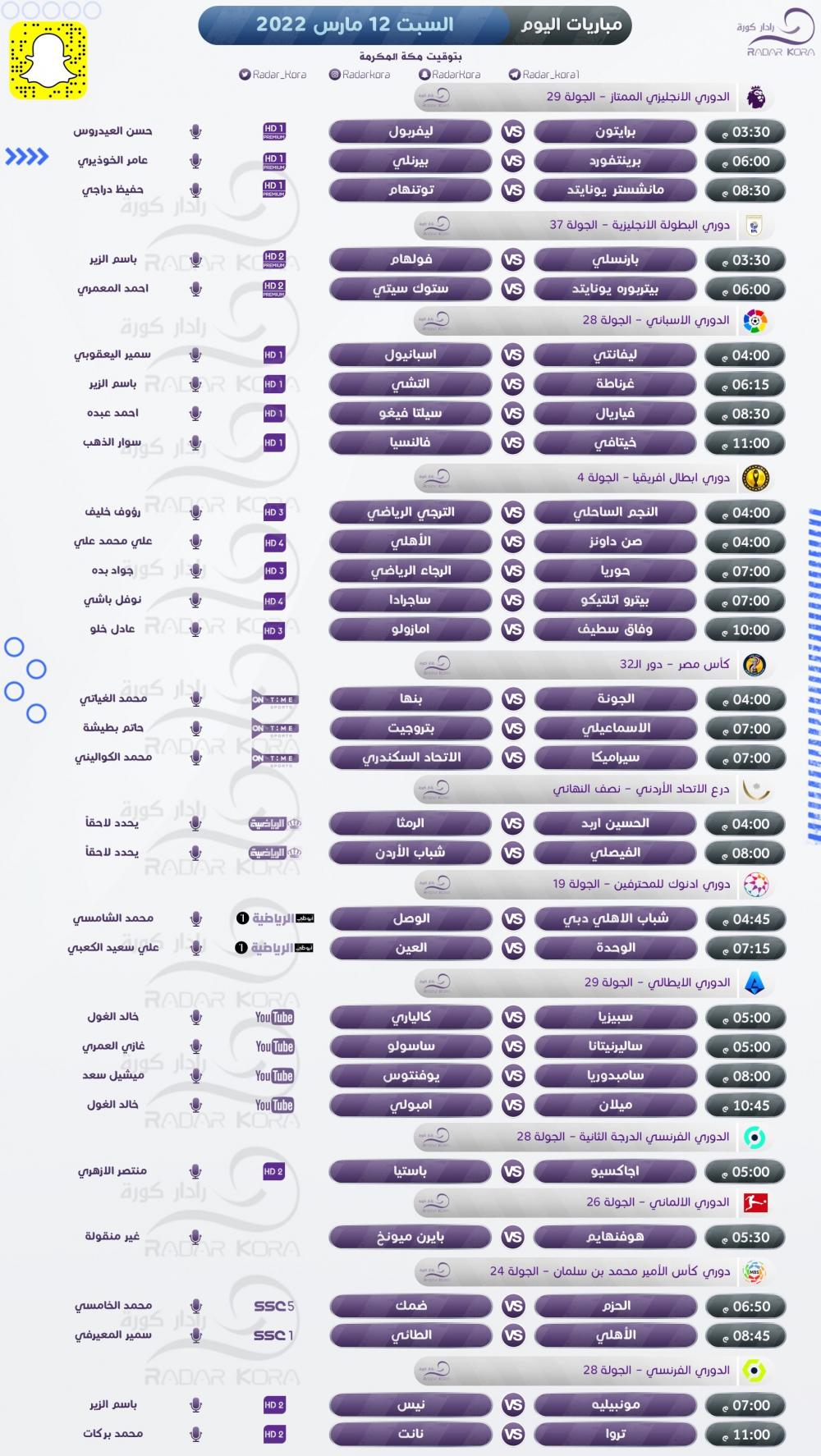 تتجه أنظار عشاق كرة القدم اليوم السبت لعدة مباريات في الدوريات الأوروبية، وأبطال إفريقيا.